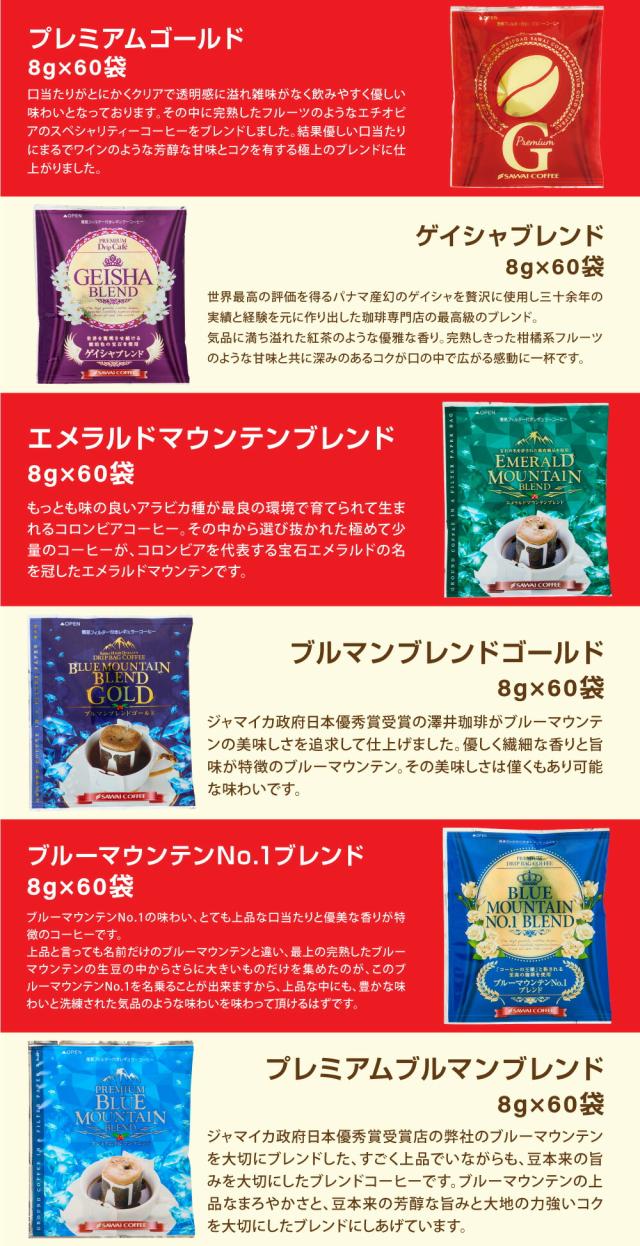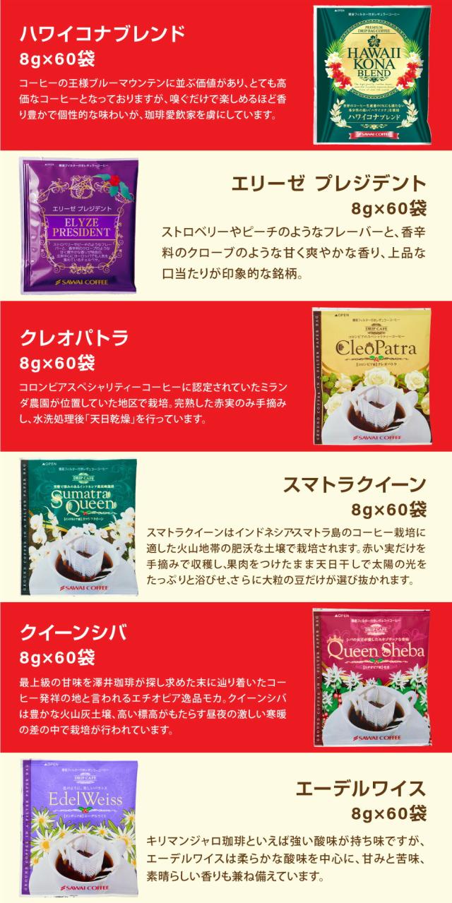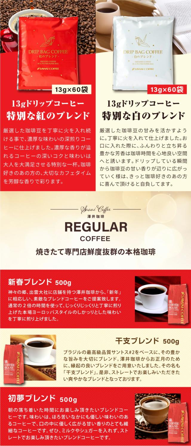 | 内容量 | 【レギュラーコーヒー】 ・新春ブレンド 500g×1袋 ・干支ブレンド 500g×1袋 ・初夢ブレンド 500g×1袋 ・ブレンドフォルテシモリッチ 500g×1袋 ・ビクトリーブレンドリッチ 500g×1袋 ・ブルーマウンテンNo.1ブレンド 500g×1袋 ・幻のゲイシャブレンド 500g×1袋 ・ハワイコナブレンド 500g×1袋 ・金のやくもブレンド 500g×1袋 【ドリップバッグ】 ・プレミアムゴールド 8g×60袋 ・ゲイシャブレンド 8g×60袋 ・エメラルドマウンテンブレンド 8g×60袋 ・ブルマンブレンドゴールド 8g×60袋 ・ブルーマウンテンNo.1ブレンド 8g×60袋 ・プレミアムブルマンブレンド 8g×60袋 ・ハワイコナブレンド 8g×60袋 ・エリーゼ プレジデント 8g×60袋 ・クレオパトラ 8g×60袋 ・スマトラクイーン 8g×60袋 ・クイーンシバ 8g×60袋 ・エーデルワイス 8g×60袋 ・13ドリップ 特別な紅のブレンド 13g×60袋 ・13ドリップ 特別な白のブレンド 13g×60袋 ・プレミアムゴールド×2袋 |