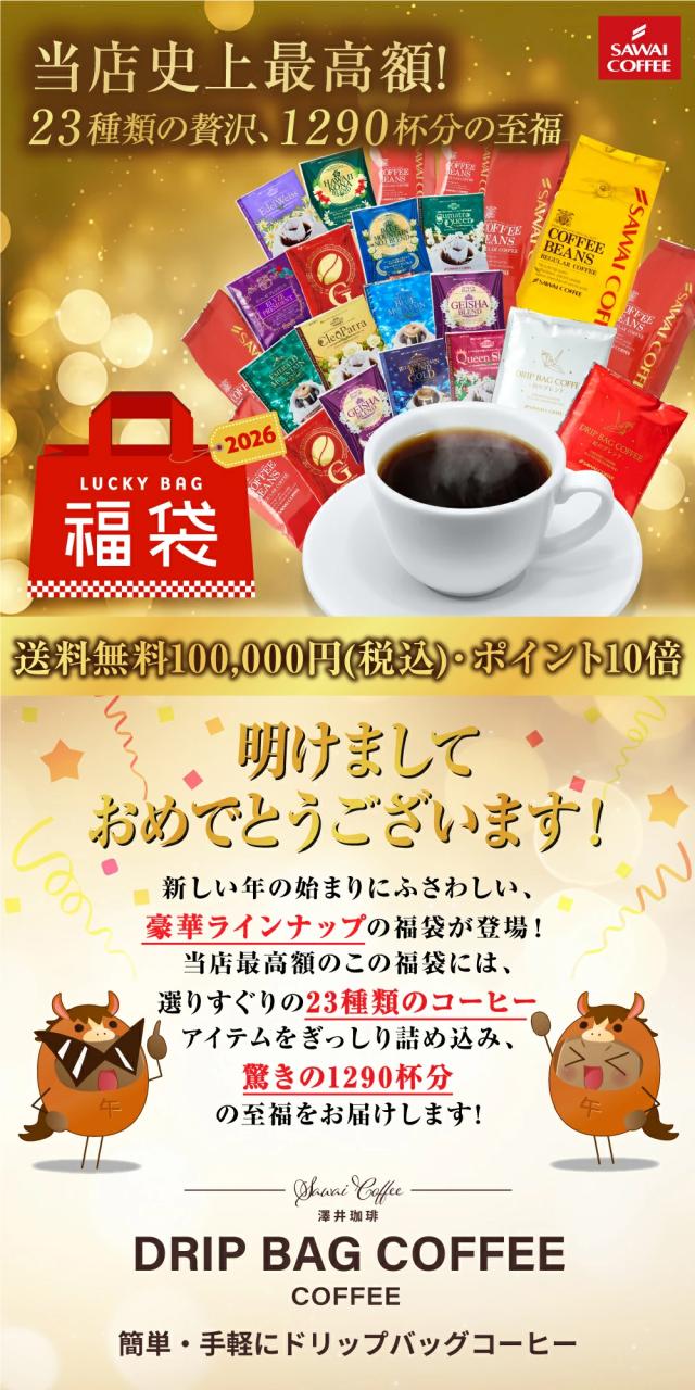 厳選された23種類のコーヒーがセットになった豪華な福袋。合計1290杯分の贅沢なコーヒーで、新年を特別なひとときに変えます。