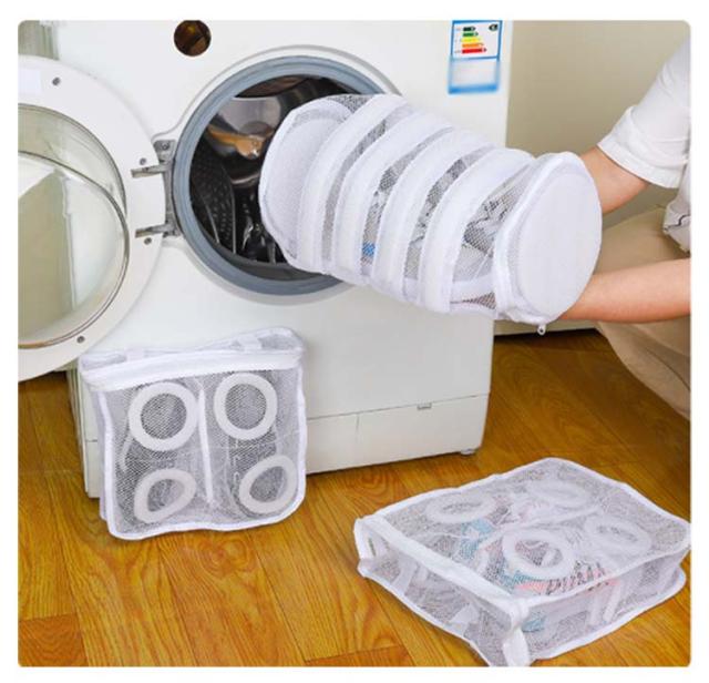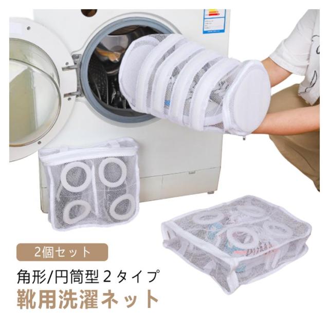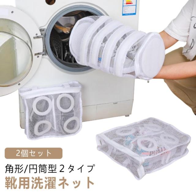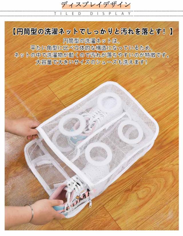 | 吊り下げ&折りたたみ可能 角形/円筒型2タイプ 靴用洗濯ネット 2個セット 【円筒型の洗濯ネットでしっかりと汚れを落とす!】 円筒型の洗濯ネットは、平たい角型に比べ立体的な構造になっているため、 ネットの中で洗濯物が動くので汚れが落ちやすいのが特徴です。 大容量で大きいサイズのシューズも洗えます! 【2つの構造で高機能の実現!】 構造1 スポンジで衝撃、騒音を抑える ネットを囲う様に設置されたスポンジは、洗濯中の内外からの衝撃を吸収、靴をしっかり守り騒音も軽減します。 構造2 粗いメッシュで洗浄力UP ネット外側は網目の粗いメッシュ生地。 網目の粗いメッシュ生地は、洗剤や水が十分に行き届き、汚れが落ちやすくなります。 【掛け紐付きでそのまま干せる!】 掛け紐が付いているので、洗濯が終わったらそのままネットごと干し竿などに吊るして干せます。 ●水はけ抜群のメッシュ生地なのでネット自体も乾きやすい ●2個のスナップで吊り高さも調整できる まだまだ、ここもすごい! 衣類にも使える 折りたたみ可 | |
