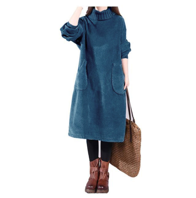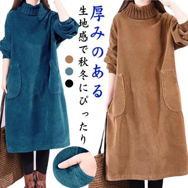 裏起毛 コーデュロイワンピース レディース 秋冬 ハイネック ロングワンピース 長袖 リブ ワンピース 異素材 チュニック 切り替え 無地 厚手 タートルネック ミモレ丈 ビッグポケット 防寒 カジュアル チュニックワンピ 暖かい オシャレ M L XL 2XL 送料無料