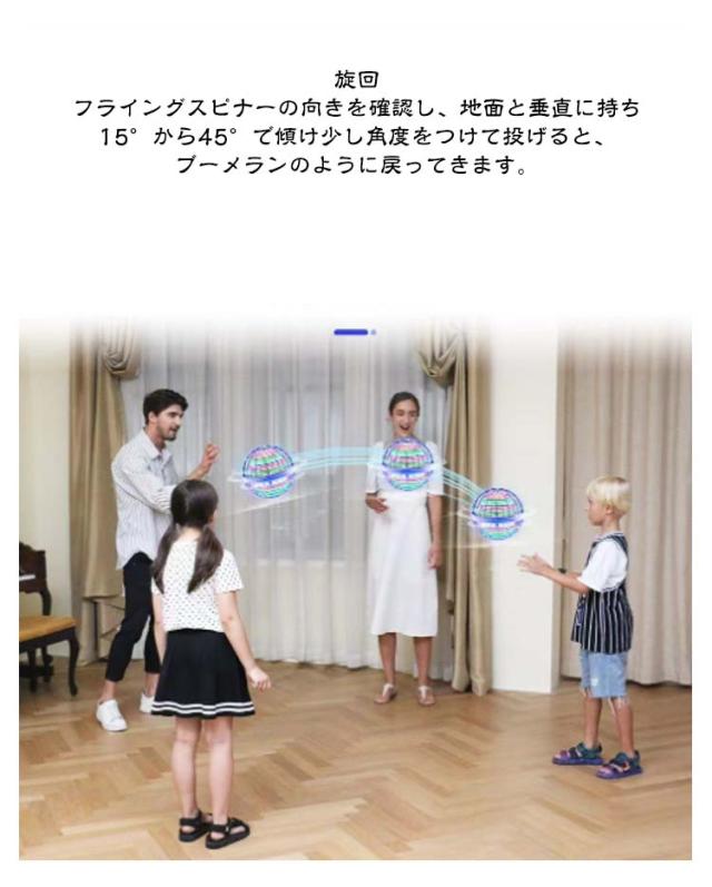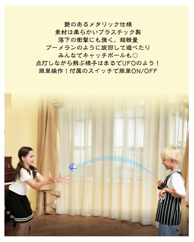 | 【飛んで!光って!】【フライングボール】 新感覚!フライングスピナーの登場! 話題の!飛んで!光って! 大人から子供までみんなで遊べる不思議な魔法のボール! 艶のあるメタリック仕様 素材は柔らかいプラスチック製 落下の衝撃にも強く、超軽量 ブーメランのように旋回して遊べたり みんなでキャッチボールも◎ 点灯しながら飛ぶ様子はまるでUFOのよう! 簡単操作!付属のスイッチで簡単ON/OFF ★旋回 フライングスピナーの向きを確認し、地面と垂直に持ち 15°から45°で傾け少し角度をつけて投げると、 ブーメランのように戻ってきます。 ※フライングスピナーを投げる際、傾斜角度が大きい程 飛行速度が速くなります。まずは小さい角度で、短い距離から 始め、徐々に角度を大きくしていく事をオススメします。 コツを掴んでフライングスピナーをお楽しみください♪ 【ご使用参考】 電源スイッチキーを1回軽く押すと、LEDランプが点灯し、 羽根が回転しますので、フライングスピナーをお楽しみください。 本体電源起動後の再始動/一時停止等は全て 付属のON/OFFスイッチにて行ってください。 ご使用後は、スイッチにて一時停止後、本体のスイッチキーを 押して頂くと本体の電源が切れます。 フライングスピナーご使用時は上下の向きにご注意ください。 必ず、本体スイッチを上にして(球体のつなぎ目が地面と平行に) 使用して下さい。 | |