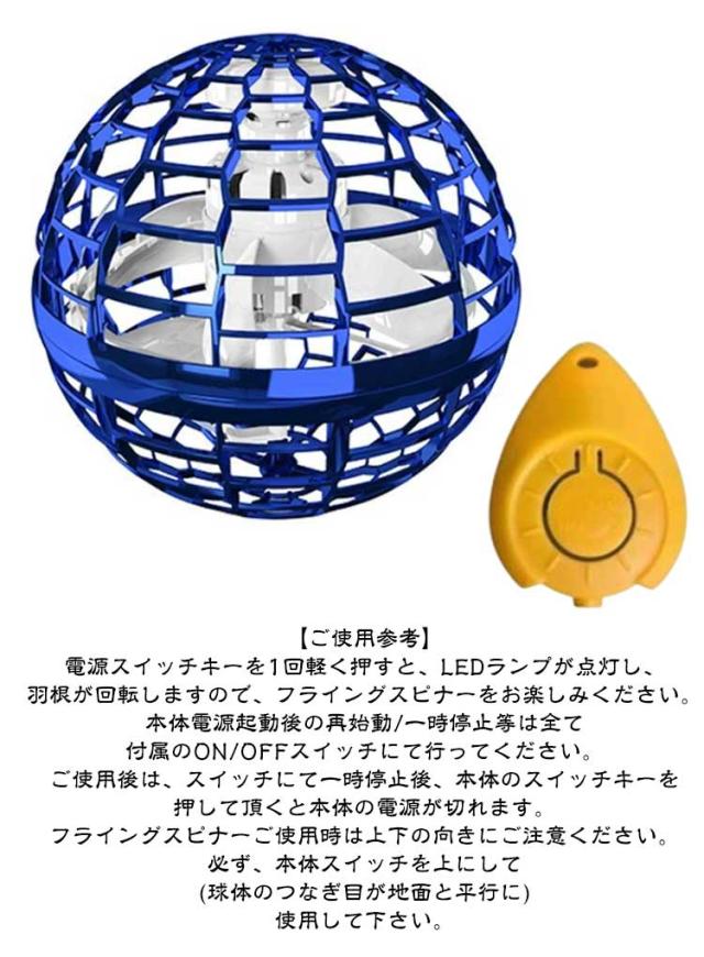| サイズについての説明 | 【パッケージ内容】 ・フライングスピナー本体×1 ・ON//OFスイッチ×1 ・充電ケーブル(microUSB)×1 ・取扱説明書(英語)×1 ※日本語の説明書は付属しておりませんので、当店ページを参考にして頂けると幸いです。 |