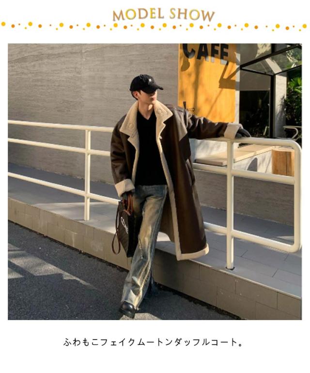 | ふわもこフェイクムートンダッフルコート。 柔らかく高い保温力で真冬でも大活躍する!ソフトなタッチで、柔らかな着心地を体感できます。 裾から袖まで裏起毛となっており、厳しい寒さでも暖かく体を包み込んでくれます。 落ち着いた大人な着こなしから、トレンドの韓国ファッションスタイルまで、シンプルなデザインにより幅広い着こなしで楽しめます。 シンプルでどんなスタイルにあわせても男らしくキマる、 ヘビロテ確実の本命アウター! | |