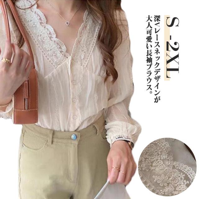 レース オフィス レース 長袖 シアー 上品 オフィスカジュアル ブラウス 刺繍 レディース ボリューム袖 無地 きれいめ 韓国 パフ袖 カジュアル ベージュ Vネック ボリュームスリーブ 大人可愛い レースブラウス シャツ 春 夏 秋 冬 春夏 春秋