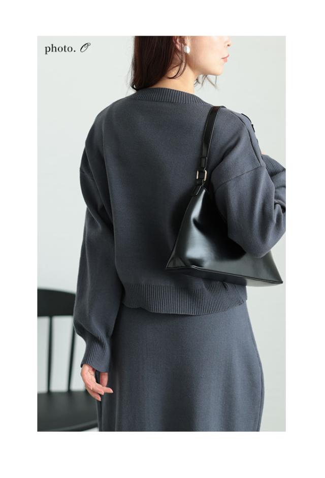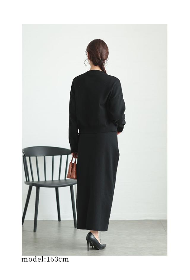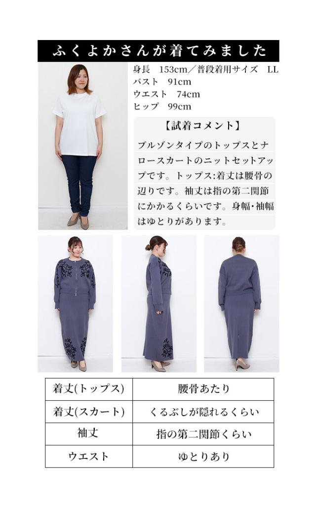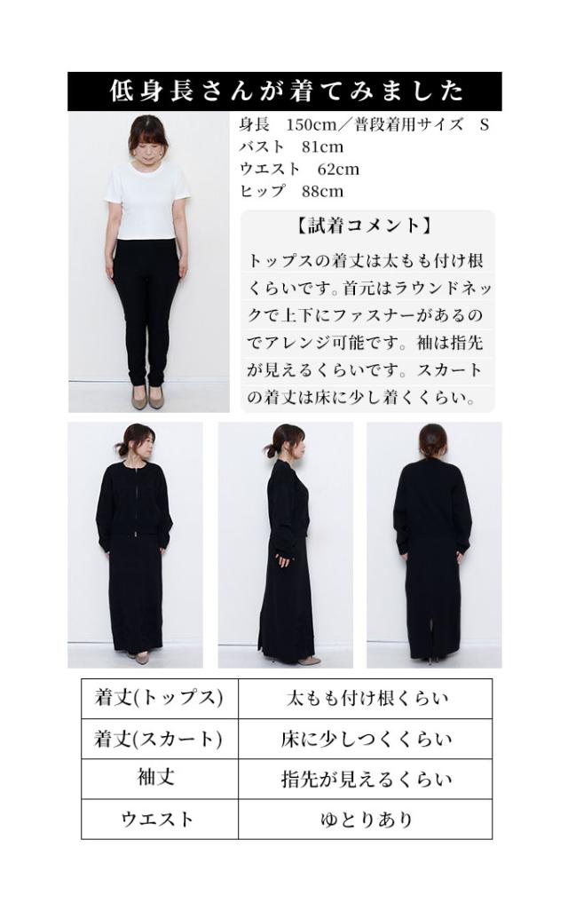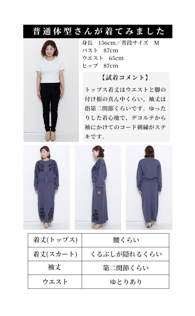 トップス着丈はウエストと脚の付け根の真ん中くらい、袖丈は指第二関節くらいです。ゆったりした着心地で、デコルテから袖にかけてのコード刺繍がステキです。フロントは上下から開閉できるファスナーで、着こなしのアレンジ可能です。スカート丈はくるぶしが隠れるくらいのストンとしたシルエットです。ウエスト総ゴム入りで楽な穿き心地でした。前裾にコード刺繍、後ろ膝下までのスリット入りで足さばきも楽です。柔らかいニットでチクチク感はなく、上下別々のコーデも色々楽しめそうですね。