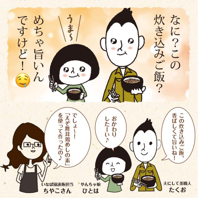 [具材]舞茸(北海道産)、鶏肉(北海道産)、醤油、人参、砂糖、発酵調味液、酵母エキス、(一部に小麦・大豆・鶏肉を含む)