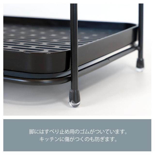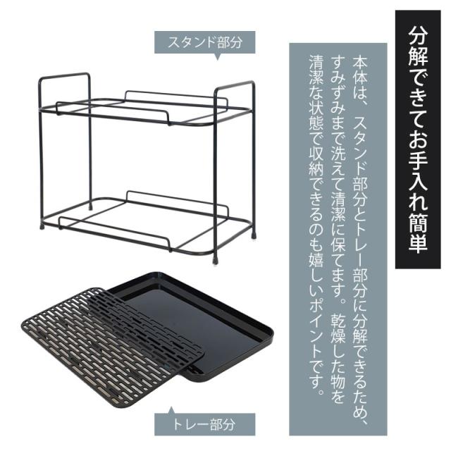 | 商品説明 | 『トレー付きジャグボトル&グラススタンド ワイドタイプ』は、ジャグボトルや水筒、グラスをまとめて乾燥できる大容量の2段スタンドです。 キッチンカウンターやシンク周りの狭いスペースにもすっきり収まる奥行き約19cmのワイド設計で、家族全員分のボトルやコップを効率よく乾燥できます。 特徴: 水筒、ジャグ、グラス類の専用スタンド 背の高いジャグボトルや水筒は上段、タンブラーやグラス類は下段に分けて置くことができるので、洗い物が多い日も整理整頓が簡単。 ボトルが横倒しになることなく、安定して乾燥できるため、毎日使うキッチンアイテムの管理が快適です。 高さがあり、出し入れしやすい設計 上段と下段の間には約16cmの空間があり、ミニサイズの水筒やタンブラー、コップの出し入れもスムーズ。 グラス類もラクに取り出せるので、日常使いにぴったりの設計です。 水切れ抜群のトレー付き 各段には水切り穴が付いたトレーがあり、水滴がスムーズに下部へ流れ落ちるため、ボトルやグラスの乾燥が早く、衛生的に使用できます。 トレーは取り外して簡単にお手入れができるので、清潔さを保つことができます。 ワイド設計で収納力抜群 奥行き19cmのワイドな設計で、キッチンのちょっとしたスペースを有効活用。 グラスやマグを並べて置けるサイズ感で、たくさんのアイテムをスッキリ収納可能です。 特に、毎日何度も使う水筒やグラス類の専用スペースとして便利です。 脚にはすべり止め用のゴムがついています。 キッチンに傷がつくのも防ぎます。 |
