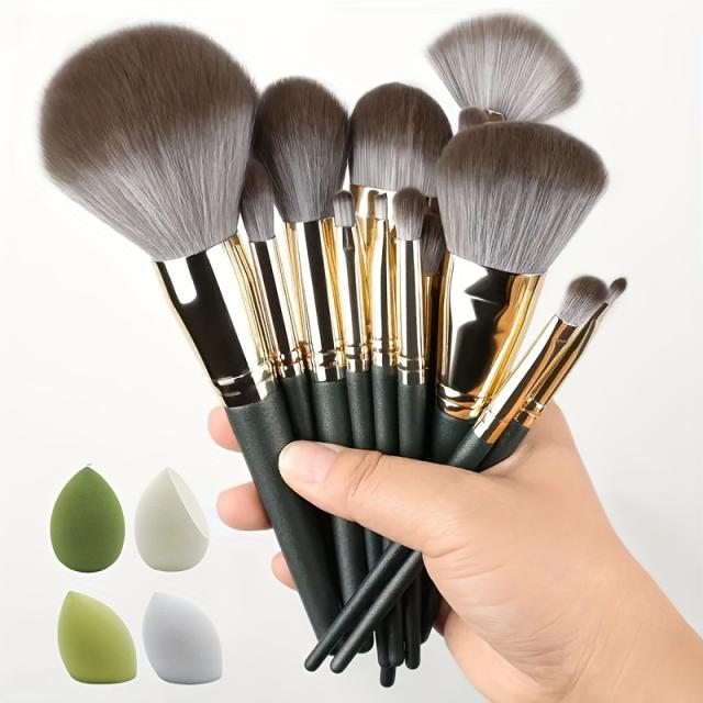 メイクブラシ 14 本プロフェッショナルブラシセットグリーンソフトパウダーファンデーションフェイスアイアイブロウシャドウ