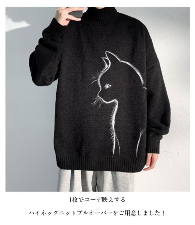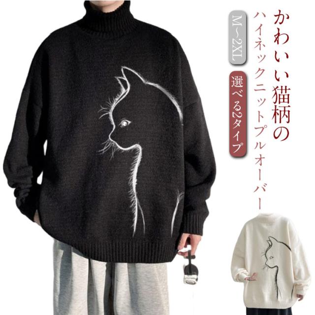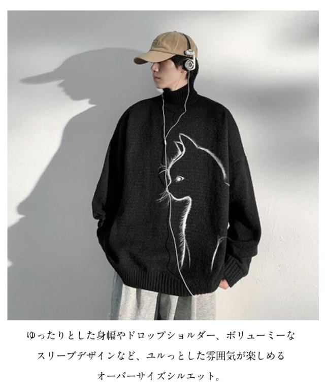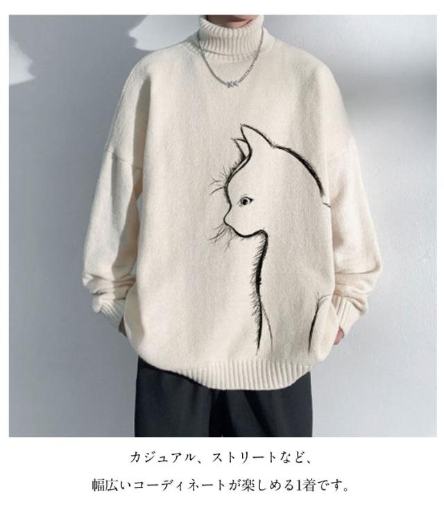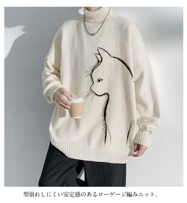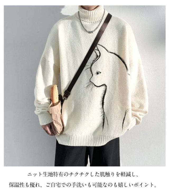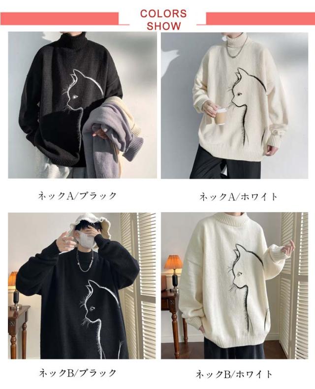 セーター トップス ボルトネック メンズ 長袖 かわいい セーター ブラック 猫柄 ニット 厚手 ネコ プルオーバー タートルネック ホワイト 暖かい 秋 冬 ゆったり オーバーサイズ 防寒 保温 可愛い シンプル 猫 ギフト プレゼント