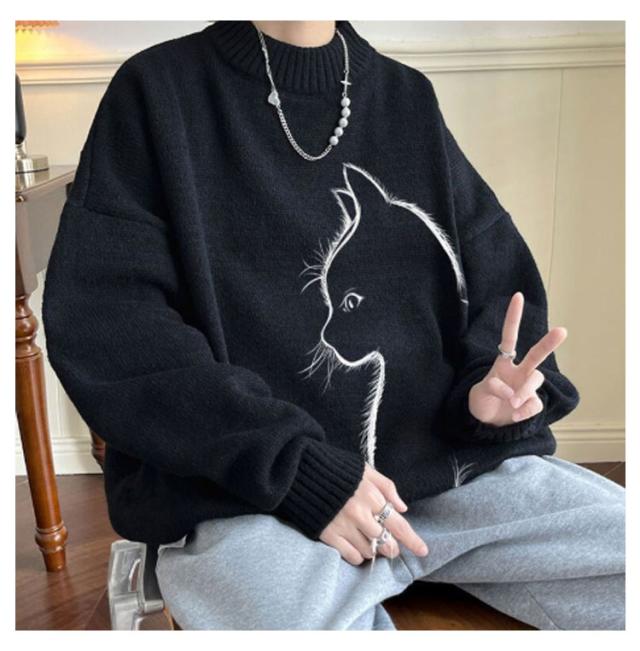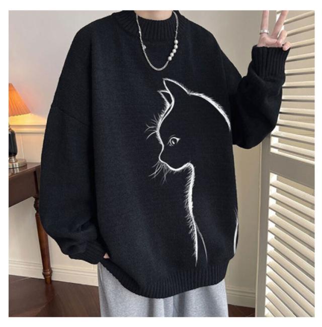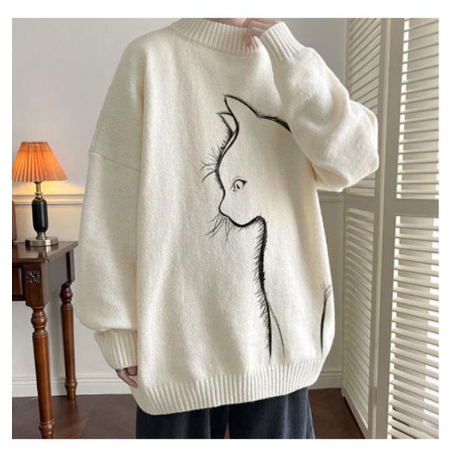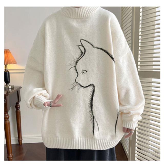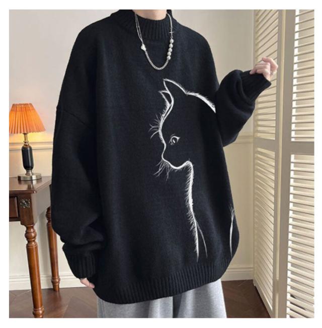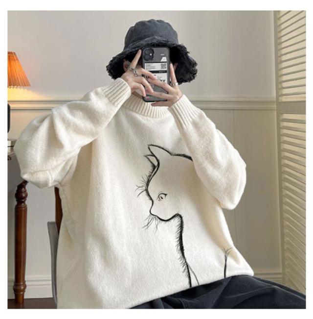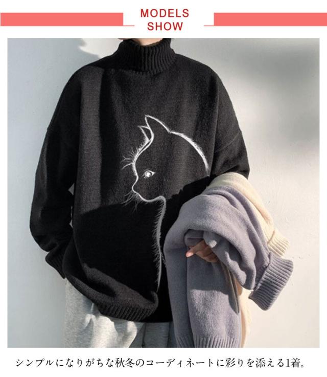 セーター トップス ボルトネック メンズ 長袖 かわいい セーター ブラック 猫柄 ニット 厚手 ネコ プルオーバー タートルネック ホワイト 暖かい 秋 冬 ゆったり オーバーサイズ 防寒 保温 可愛い シンプル 猫 ギフト プレゼント