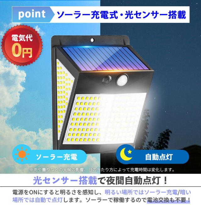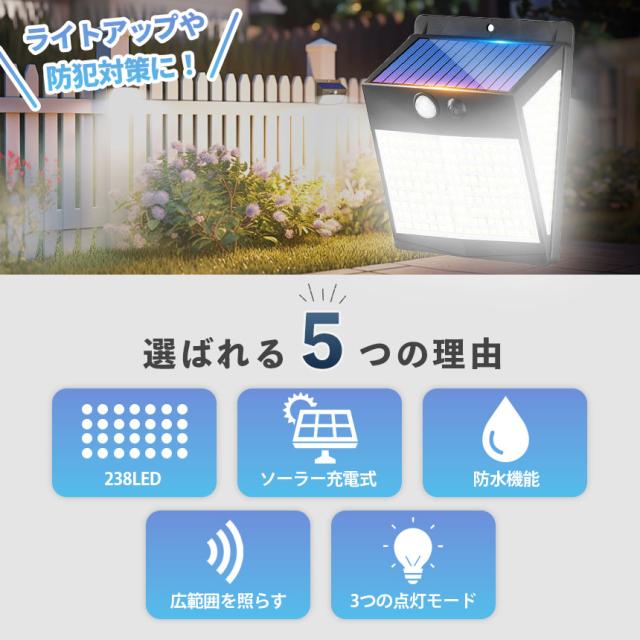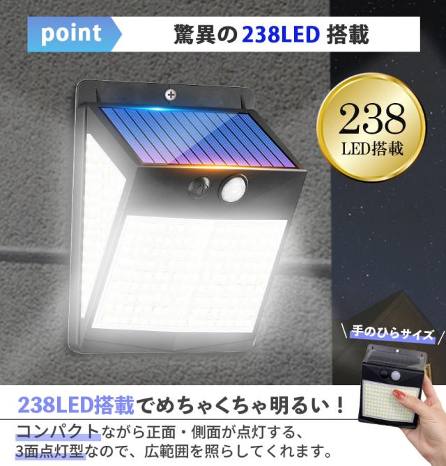 ソーラーライト センサーライト LEDライト ライト ガーデンライト 人感センサー 防犯 セキュリティ 防犯グッズ ソーラー ソーラーパネル 防水 壁付け 屋外 庭 ライトアップ 自動点灯 明るい 照明 238LED 簡単 屋外照明 太陽光発電 おしゃれ 電気代0円