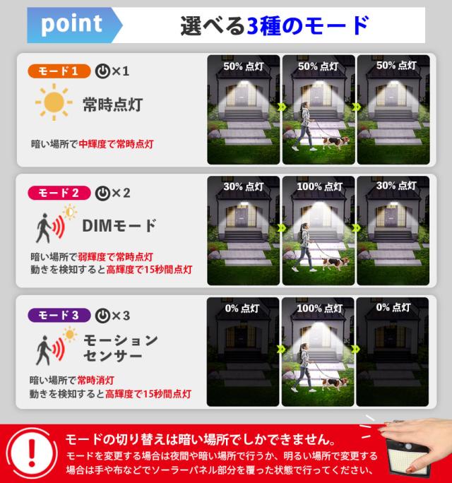 ※※明るい場所でモードの切り替えを行う場合は手や布などでソーラーパネル部分を覆った状態で行ってください※※
