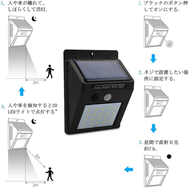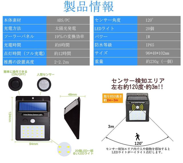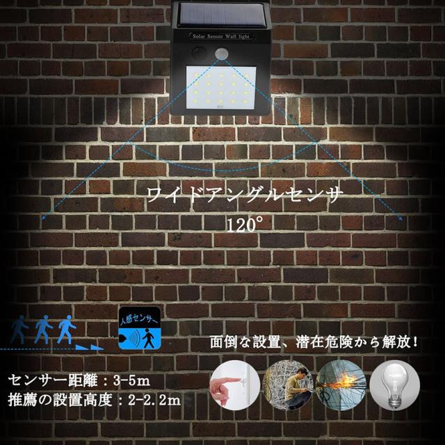 20LED センサーライト 屋外 ソーラーライト 高輝度 防犯 人感 防水 屋外照明 120°照明範囲 防犯ライト 夜間自動点灯 太陽光発電 庭 玄関 駐車場 通路 ガーデン LEDライト ガーデンライト 人感センサー セキュリティ 防犯グッズ ソーラー 壁付け 屋外 明るい 照明 電気代0円
