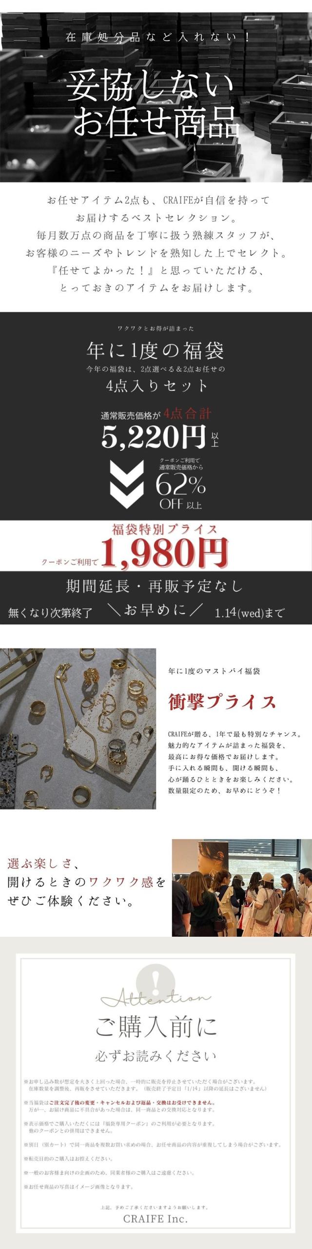| 商品説明 | CRAIFEが贈る年に一度の特別なサプライズ 通常5,220円以上のアクセサリーが、 福袋限定プライス1980円(クーポンご利用時)で手に入る! またとないチャンスです。 自分へのご褒美や大切な方へのギフトにもぴったりな、心が躍る瞬間をお届けします。 数量限定ですので、お早めにどうぞ。 |