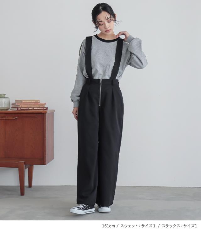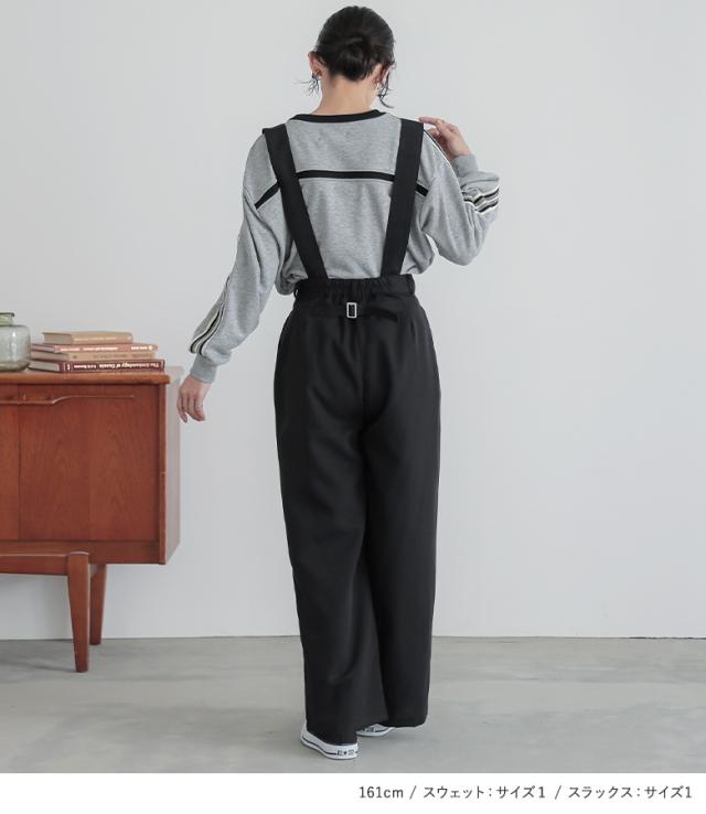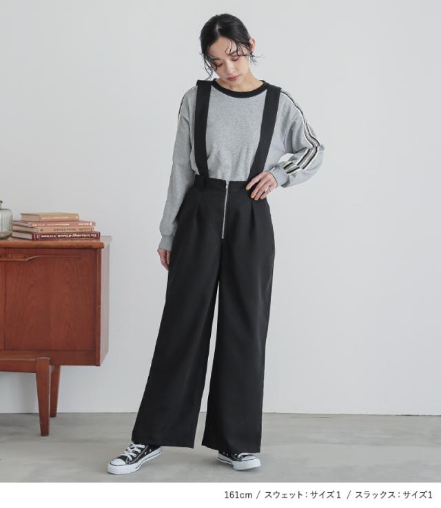 【送料無料】『サスペンダー付きスラックス×ラインテープ裏毛スウェットコーデ2点SET』【メール便不可】【40】[2点コーデセット 2024 レディース パンツ ボトムス ワイド スラックス トップス スウェット 長袖]