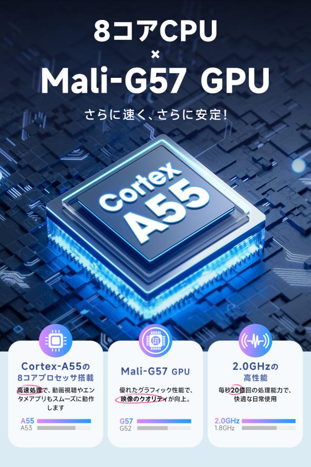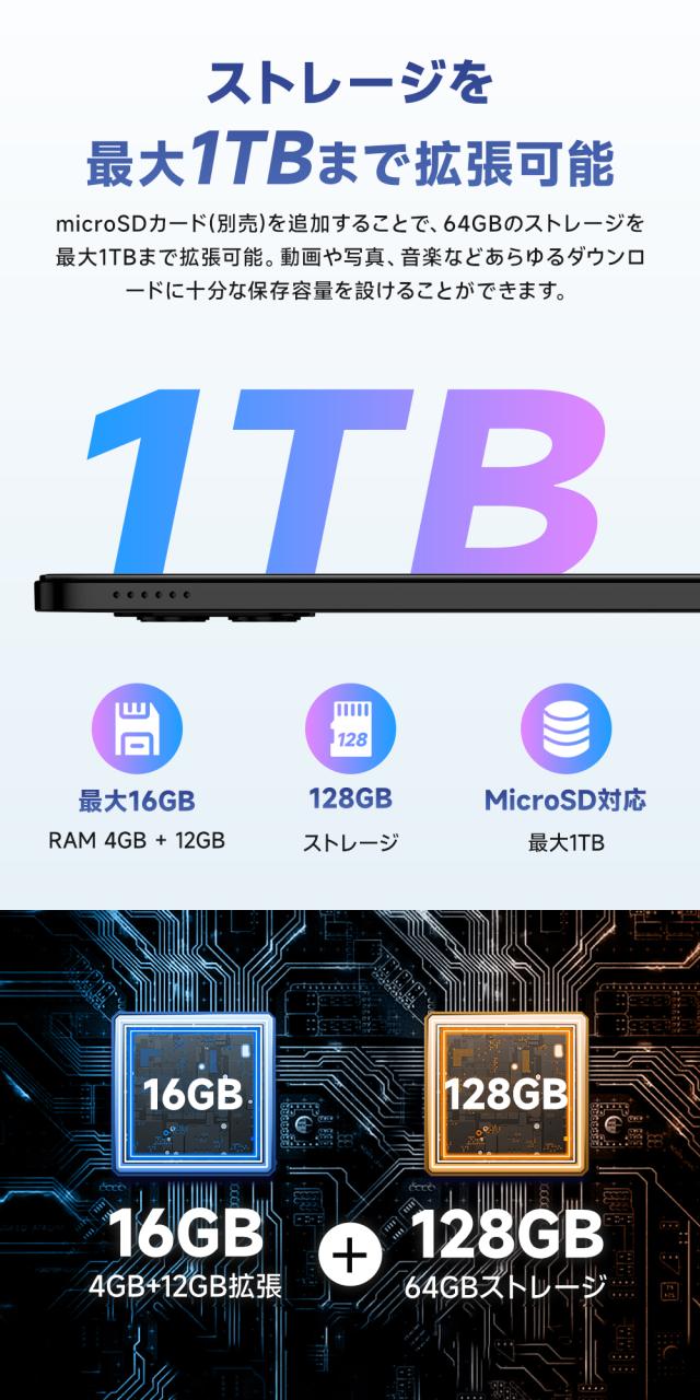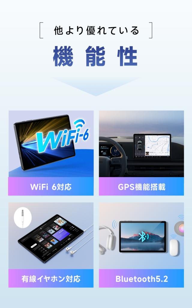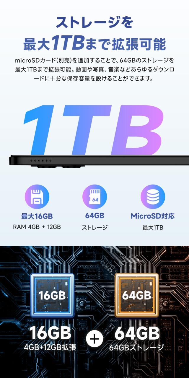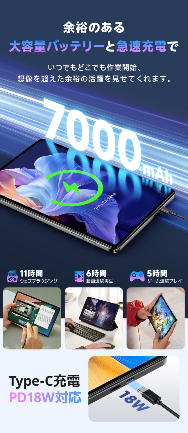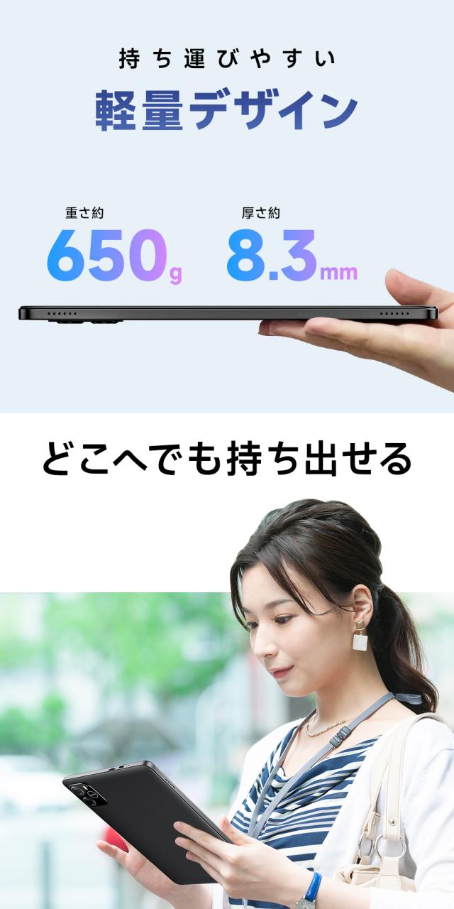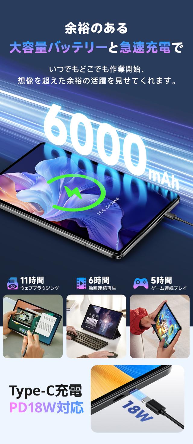 | 特徴 | 「高性能8コアプロセッサ」 8コアのプロセッサを搭載しており、アプリの起動や複数のアプリを同時に使う際もスムーズです。重いゲームや動画編集も快適に行えるため、エンターテインメントや仕事に最適です。処理速度が向上しているので、ストレスを感じることなく作業を進めることができます。 「美しいIncell IPSパネル」 10.1インチのIncell IPSパネルは、鮮やかな色合いと広い視野角を誇ります。映画や動画視聴に最適で、NetflixやYouTubeを大画面で楽しむことができます。リアルで生き生きとした映像表現により、臨場感溢れる視聴体験を提供します。さらに、屋外でも視認性が高いため、カフェや公園などでの視聴も快適です。友達と一緒に楽しむ映画鑑賞にもぴったりです。 【最大1TBのSDカード拡張】 内蔵ストレージは64GBですが、最大1TBまでのSDカードを追加できるため、大量のデータを簡単に保存できます。写真、動画、アプリを気にせずダウンロードして、思い出や趣味を存分に楽しむことができます。 「Wi-Fi 6とBluetooth 5.2」 Wi-Fi 6技術により、より高速で安定したインターネット接続が可能です。これにより、ストリーミングやオンラインゲームをスムーズに楽しむことができます。また、Bluetooth 5.2搭載により、ワイヤレスデバイスとの接続も快適で、音楽やデータの転送が迅速です。 「6000mAhの大容量バッテリー」 6000mAhのリチウムイオンポリマーバッテリーにより、長時間の使用が可能です。動画を観たり、ゲームをプレイしたりしても、充電を気にせず楽しむことができます。外出先や旅行先でも安心して利用でき、充実したタブレットライフを提供します。 |