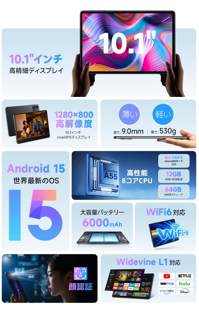 【レビュー特典付き】2026最新作 タブレット PC 本体 Android15 10.1インチ RAM12GB ROM64GB 1280*800解像度 軽量 Wi-Fi IPS液晶 6000mAh大容量 軽量 simフリー 軽量 ネット授業 人気 おすすめ wi-fi 在宅勤務 大容量バッテリー 人気 おすすめ 格安 誕生日 プレゼント