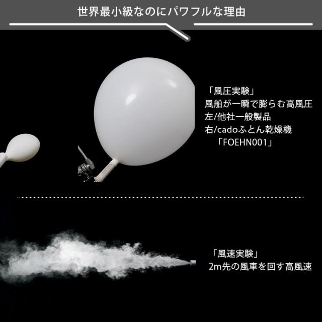cado独自の送風技術により、ふとんの隅々まで温風が行き渡ります。 一瞬で風船が膨らむ高風圧。2m先まで届く高風速。 コンパクトボディからは想像できないパワフルな温風が実現しました。(特許取得済※特許第7546969号) |