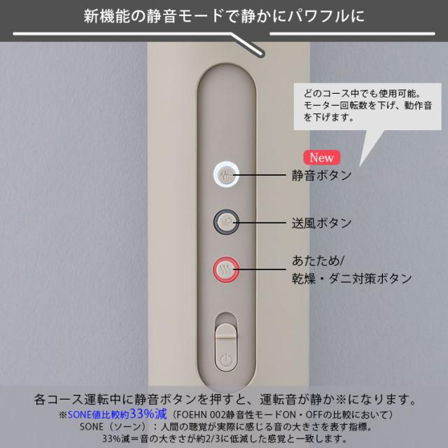 新たな機能として「静音モード」を搭載。各コース運転中に静音ボタンを押すと、運転音が静か※になります。 夜間の使用や靴乾燥スタンド(別売)併用時にも安心の、より使いやすい仕様にアップデートしました。 ※SONE値比較約33%減(FOEHN 002静音性モードON・OFFの比較において) SONE(ソーン):人間の聴覚が実際に感じる音の大きさを表す指標。33%減=音の大きさが約2/3に低減した感覚と一致します。 |