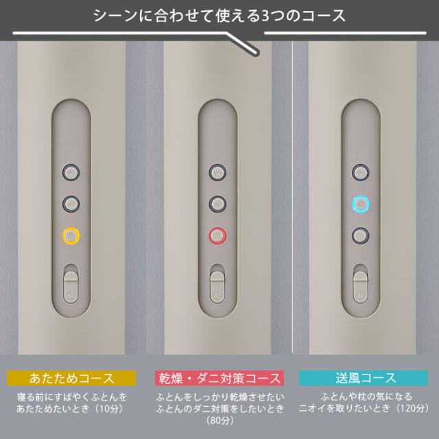 「あたため」「乾燥・ダニ対策」「送風」の計3つのコースを搭載。 ワンタッチで挿し込むだけで、ランドリーに行く手間や消臭剤を吹きかける手間から解放されます。 快眠のための習慣・環境づくりを365日サポートします。 |