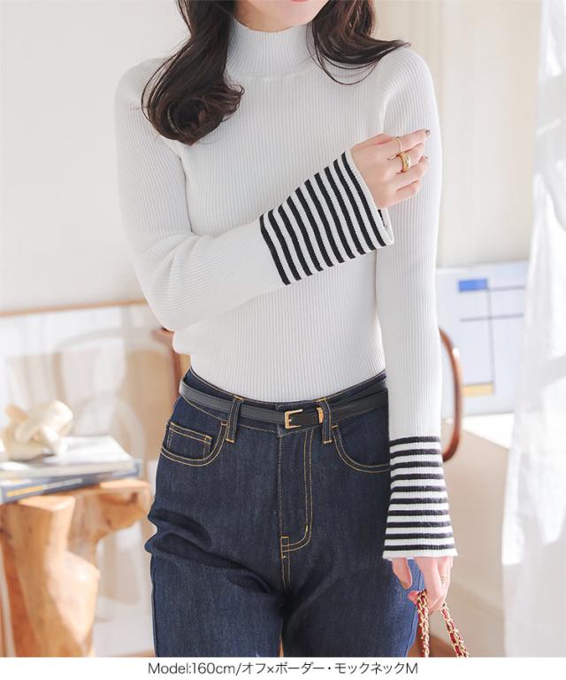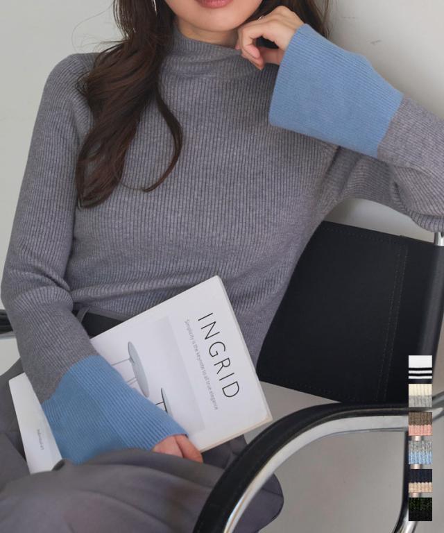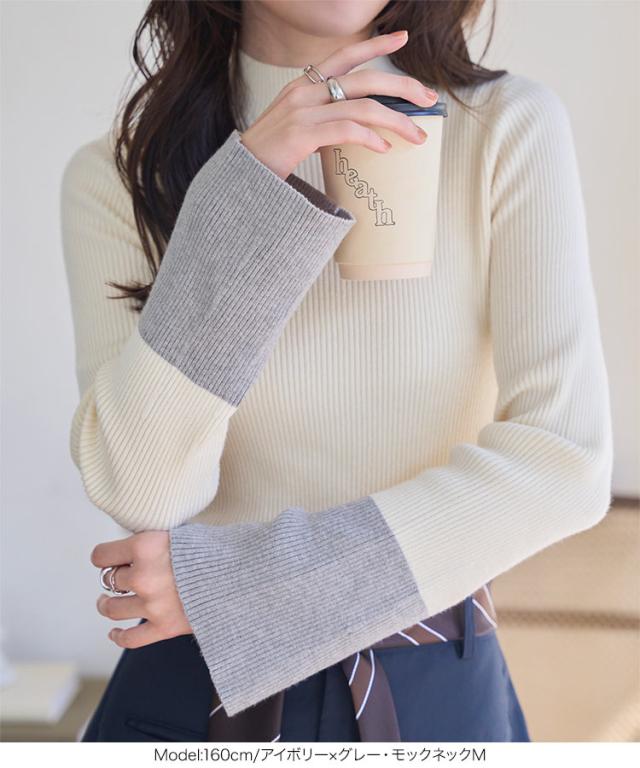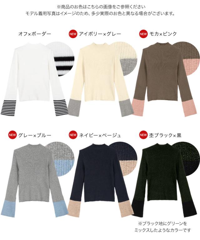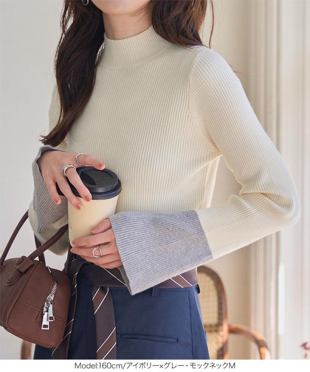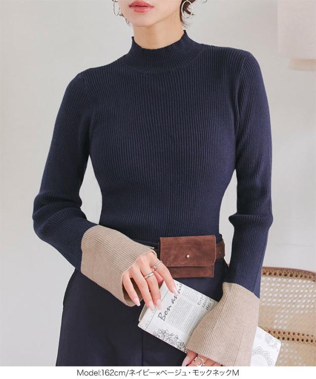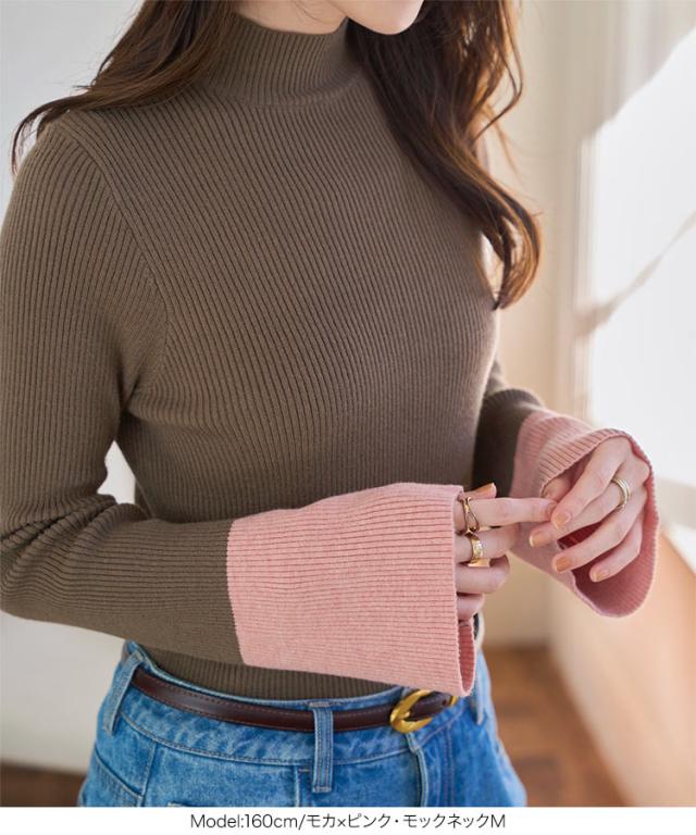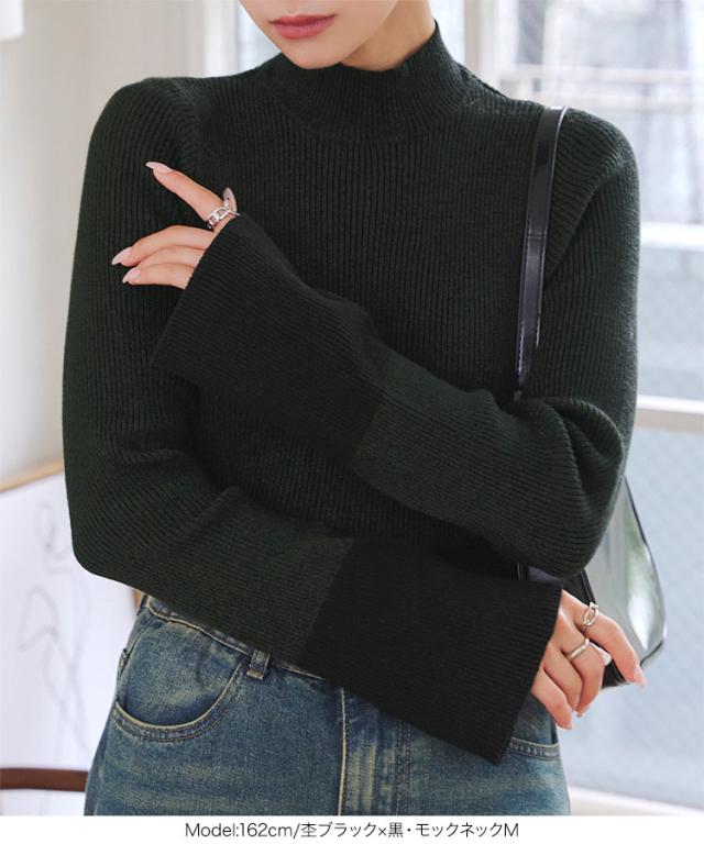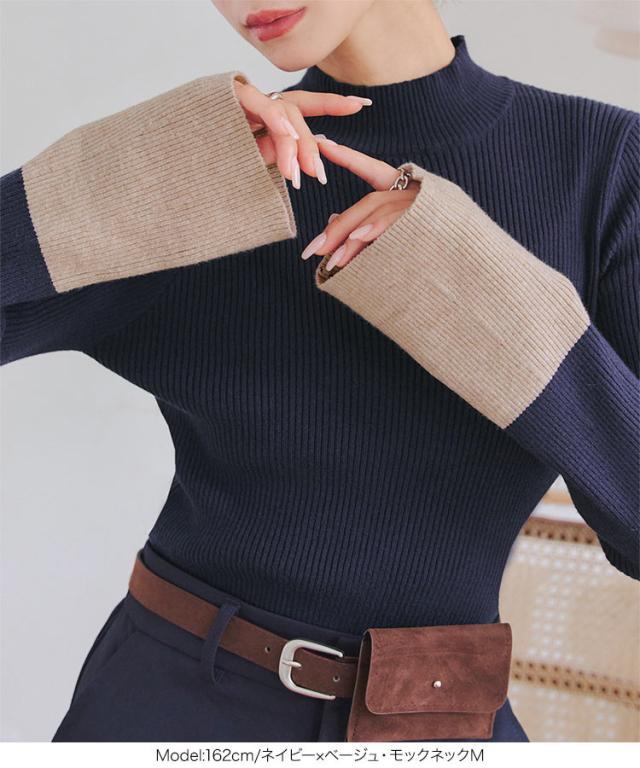 袖先配色フレアスリーブニットトップス N1157 入荷済 レディース 20代 30代 40代 ニット セーター 長袖ニット バイカラー フレアスリーブ ハイネック モックネック リブ リブニット Lサイズ レタスオリジナルサイズ