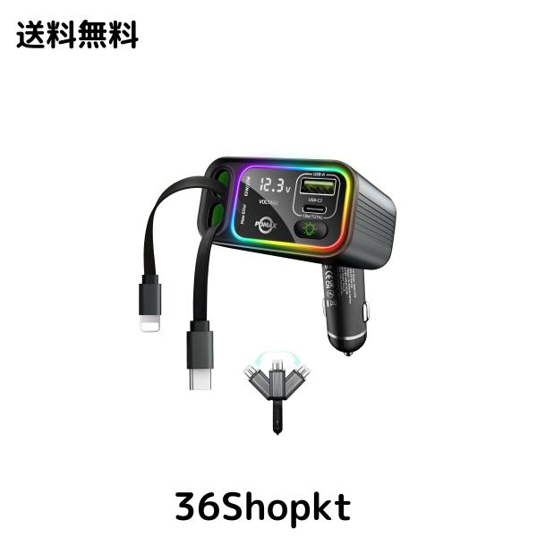 PDMAX 107W 4-in-1 車載充電器 シガーソケット USB 巻き取り式超急速充電カーチャージャーカー用品、USBケーブル2本付き(USB-C & iOS)&L