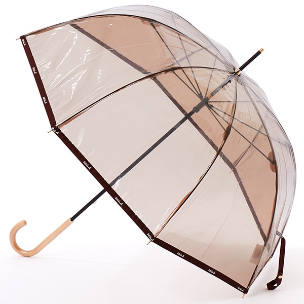 クリアカラーに高級感のある木の手元を組み合わせた上品な雨傘。落ち着いたカラーリングでどんなテイストにもマッチする汎用性の高さも魅力。裾のロゴテープのパイピングがアクセントになっています。