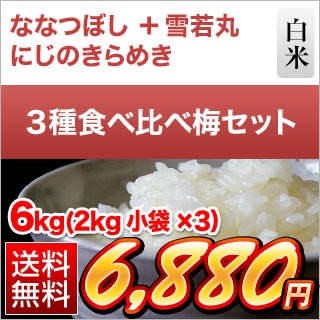 ごはんソムリエ厳選3種食べ比べ【梅】 北海道産 ななつぼし + 山形産 雪若丸 + 香川産 にじのきらめき 白米6kg(2kg×3袋)【送料無料・窒素充填包装】【即日出荷】お米 令和7年産 2025年産