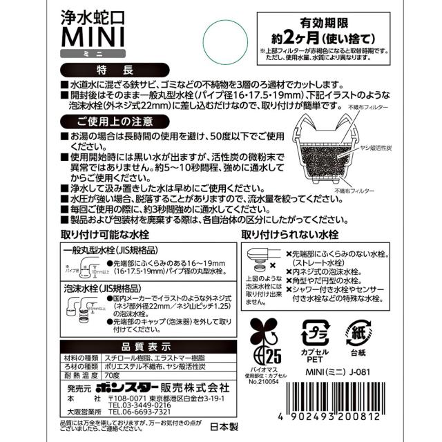 浄水器 浄水蛇口 MINI ミニ J-081 | ろ過 鉄サビ 不純物をカット 日本製 取り付け簡単 水はね防止 水道水 丸型水栓 泡沫水栓 蛇口型 キッチン 軽量 便利グッズ 自在水栓