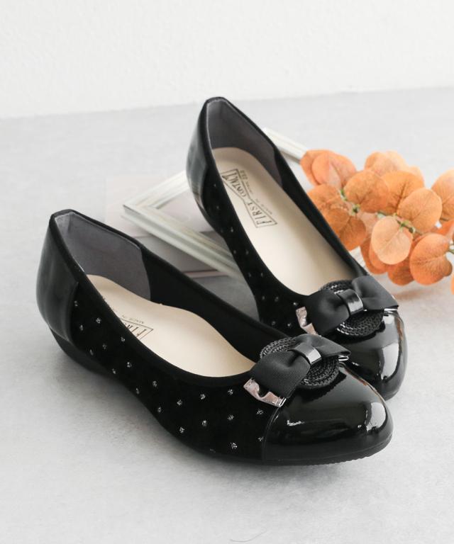 パンプス レディース ローヒール リボン エナメル ベロア アーモンドトゥ コンフォートシューズ ぺたんこ 日本製 ファーストコンタクト FIRST CONTACT 黒 ブラック ヒョウ柄 レオパード柄 豹柄 39164