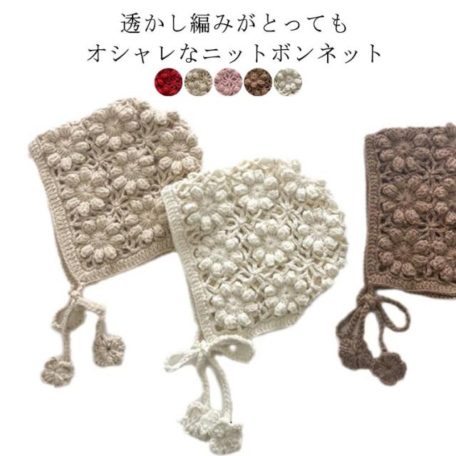 ボンネット ベビー帽子 キッズ 帽子 シンプル 女の子 韓国子供服 男の子 ベビー ニット ナチュラル 赤ちゃん 透かし編み かわいい スカラップ ニット帽 おしゃれ あご紐 ナチュラルカラー 0歳 1歳 写真撮影 アクセサリー ギフト