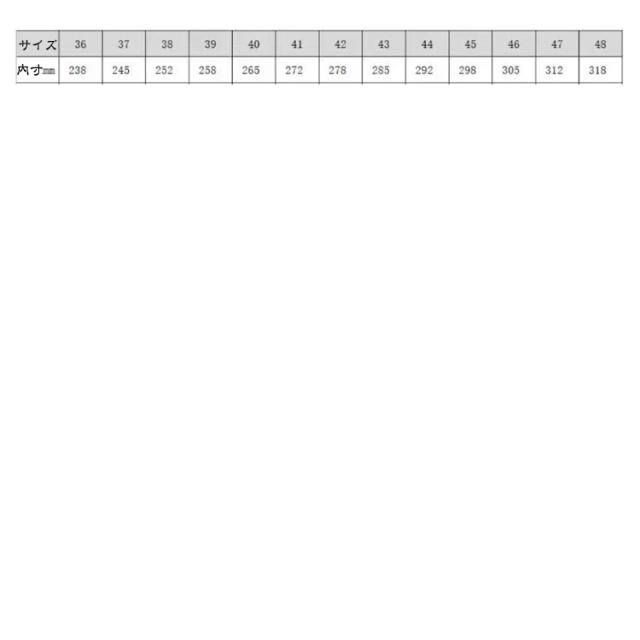 | サイズについての説明 | サイズ: 39/内寸約24.5cm 40/内寸約25.0cm 41/内寸約25.5cm 42/内寸約26.0cm 43/内寸約26.5cm 44/内寸約27.0cm 45/内寸約27.5cm 46/内寸約28.0cm 47/内寸約28.5cm 48/内寸約29.0cm 49/内寸約29.5cm ※上記サイズは平置き実寸になります。 サイズ表の実寸法は商品によって0.1-0.2cm程度の誤差がある場合がございます。 |