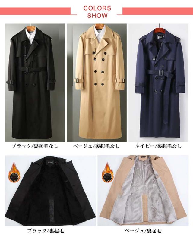 | 選べる裏起毛あり/裏起毛なし2タイプ!1つは持っておきたいメンズトレンチコート 美しいシルエットのロング丈で丁寧に作られた飽きのこないデザイン。 ロングコートでも重くなりすぎず、幅広いコーデに合わせられます! 肩肘張らない絶妙なサイズ感とラフな生地感で、デイリーに合わせやすいアイテムです。 共布のベルトでウエストマークすれば、メリハリのある着こなしに! | |