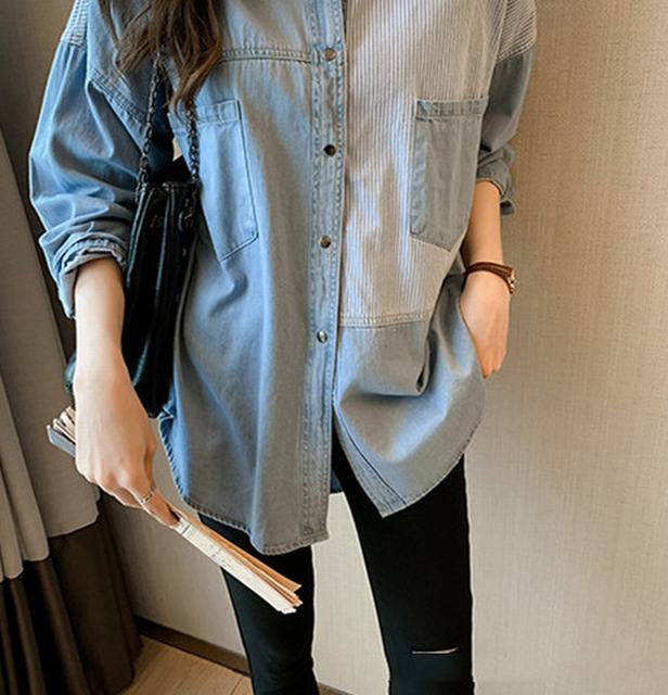 デニムシャツ レディース パッチワーク ウエスタン シャツ トップス 切替え ストライプ ゆったり ライトブルー