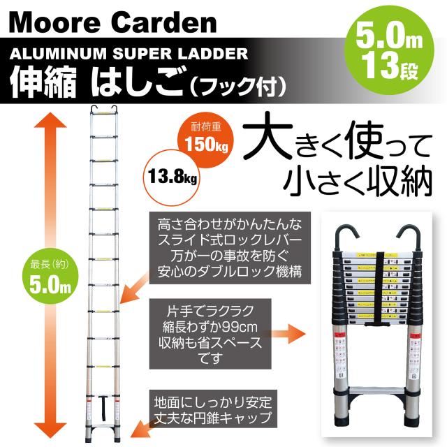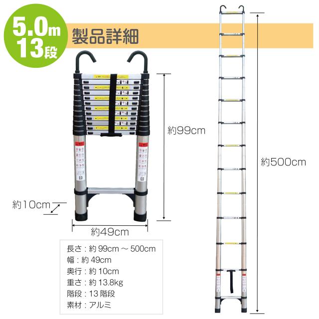 はしご 伸縮 折りたたみ フック付き はしご 5m 13段 耐荷重150kg 伸縮はしご 梯子 伸縮 アルミ製 ハシゴ 安全ロック 軽量 伸縮梯子 屋根 スライド式 折り畳み