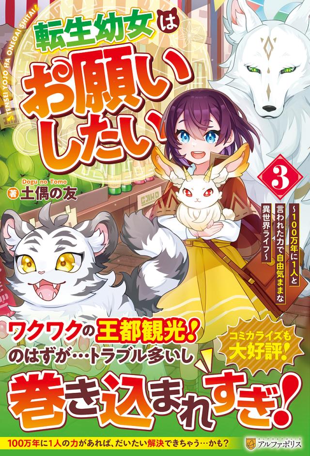 目が覚めると、子供の姿で異世界転生したサクヤ。激レアスキルをいくつも持っていた彼女は、従魔になった白虎のヴァイス、フェンリルのウィンと共に、ケンリスの街で異世界生活を楽しんでいた。青龍を救い出し、ケンリスの街のトラブルを解決したサクヤ達は、ついに王都へ行くことになった。新しく従魔になったエアホーンラビットのルビーをはじめ、仲間と一緒に観光を楽しんでいた一行だったが、ひょんなことから王都を揺るがすような事件に巻き込まれていく——!? 百万年に一人の愛され幼女は、王都でも人気沸騰!