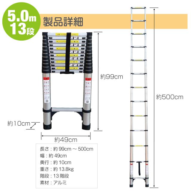 はしご 伸縮 折りたたみ はしご 5m 13段 耐荷重150kg 伸縮はしご 梯子 伸縮 アルミ製 ハシゴ 安全ロック 軽量 伸縮梯子 屋根 スライド式 折り畳み
