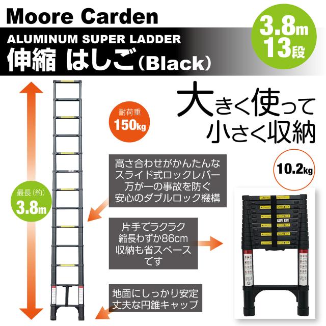 はしご 伸縮 折りたたみ はしご 3.8m 13段 耐荷重150kg 伸縮はしご 梯子 伸縮 アルミ製 ハシゴ 安全ロック 軽量 伸縮梯子 屋根 スライド式 折り畳み 黒 ブラック