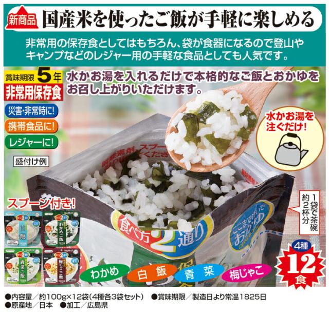 マジックライス 保存食セット 100g×12袋 4種各3袋セット 国産米100% ご飯 おかゆ わかめ 白飯 青菜 梅じゃこ スプーン付き 非常用 保存食 携帯食品 災害 備蓄 非常食 賞味期限5年 送料無料