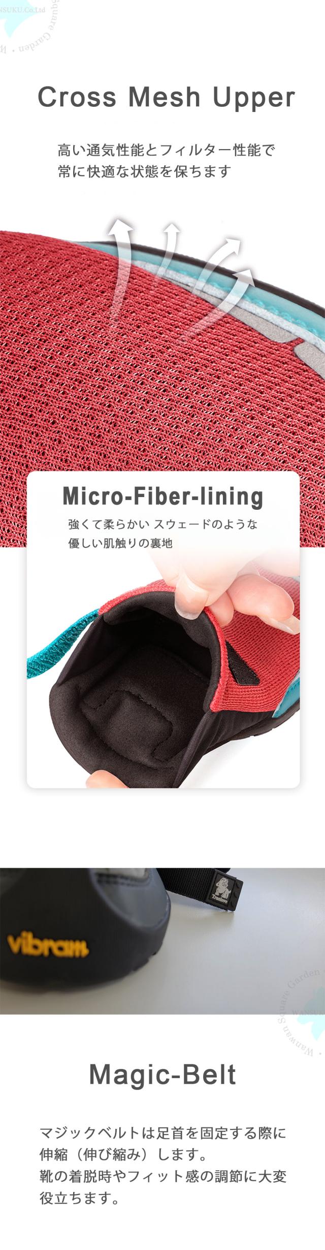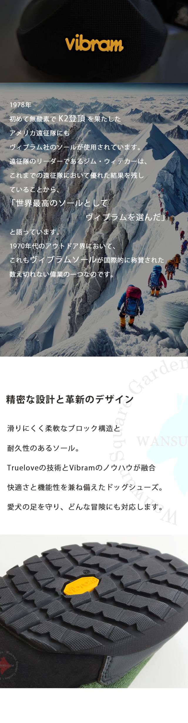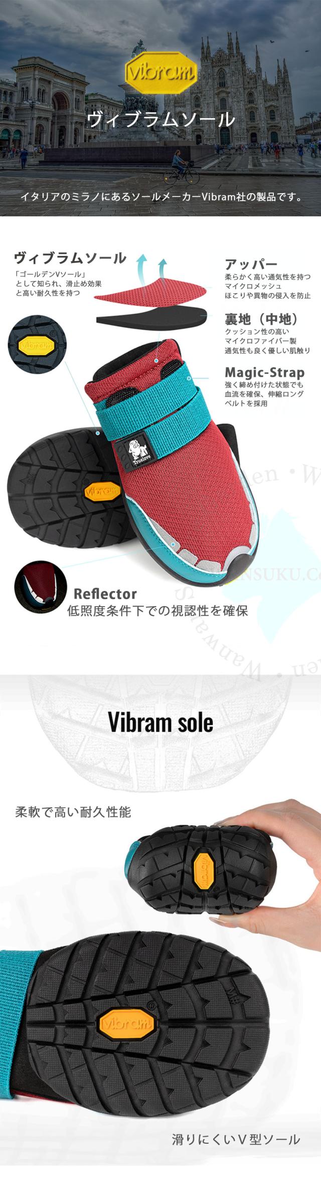 本製品はマジックテープで開口部が広がり、簡単に履かせられる設計です。ヴィブラムソールを採用し、優れたグリップ力と耐久性で愛犬の足をサポート。通気性の良いアッパーメッシュにより、足が蒸れにくく快適さを保ちます。アウトドアや日常の散歩に最適で、悪路や激しい動きにも耐えます。