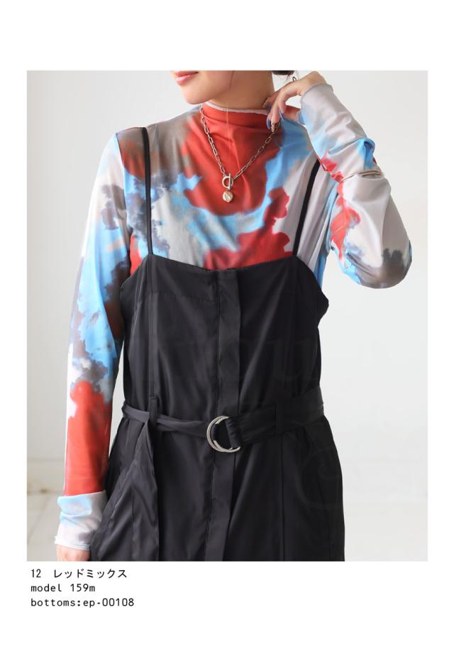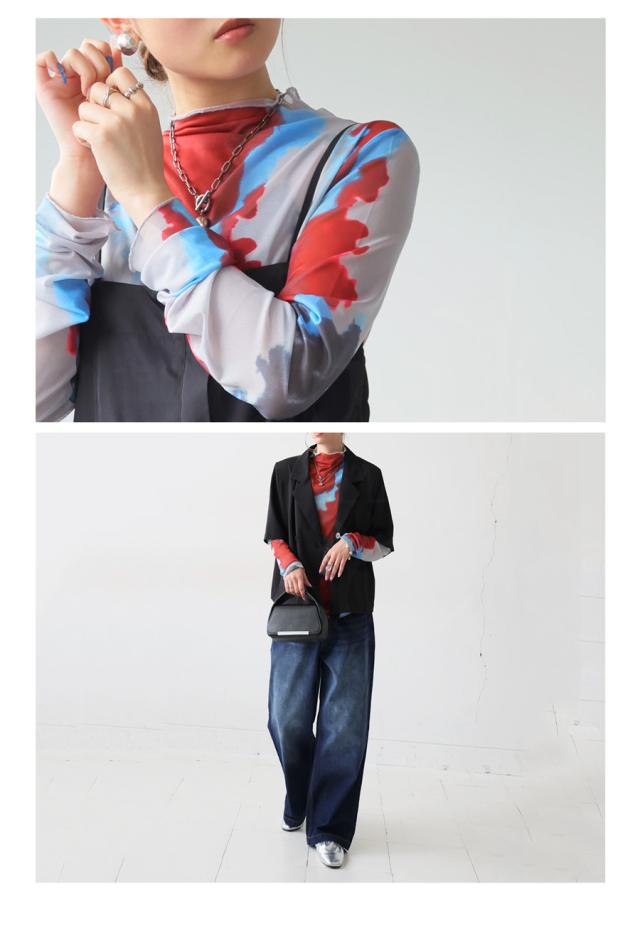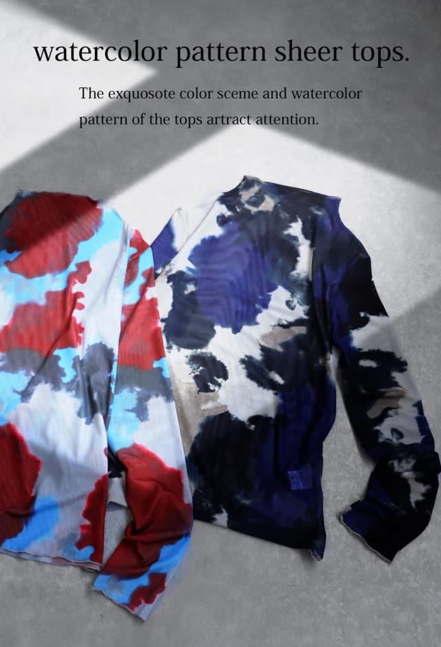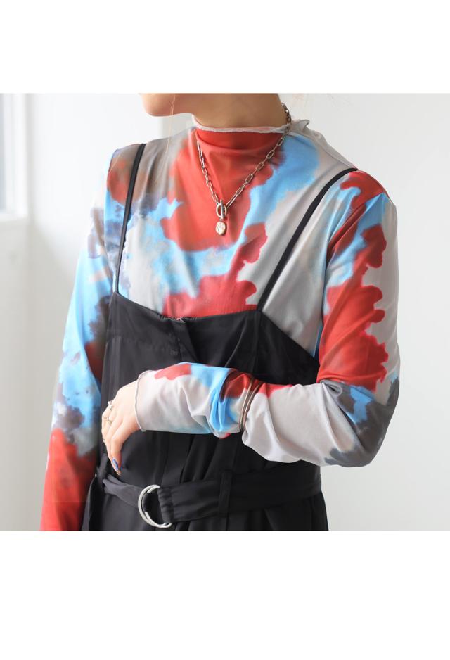 py-00804 シアー シアー素材 水彩柄 アート柄 柄 タートルネック ハイネック 高級感 総柄 モードスタイル 大人カジュアル 個性的 デザイントップス シースルー レトロ ニュアンス柄