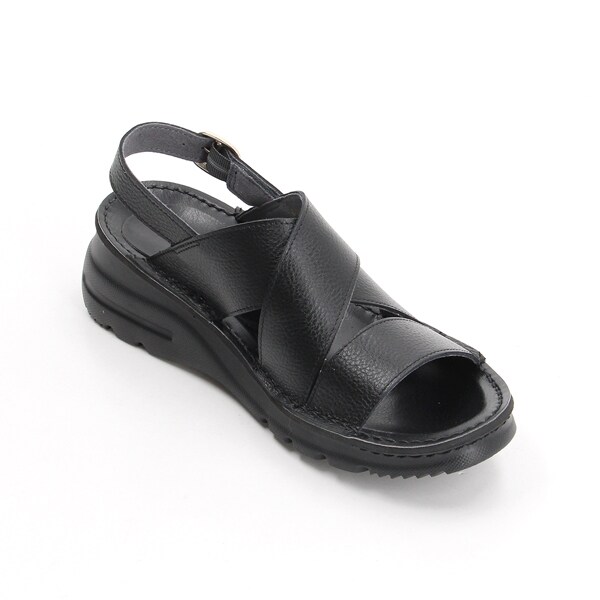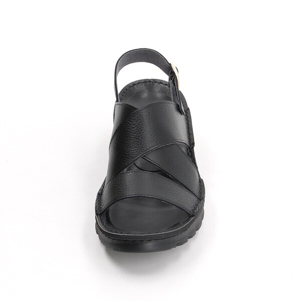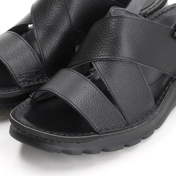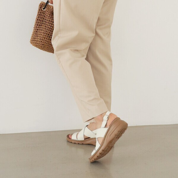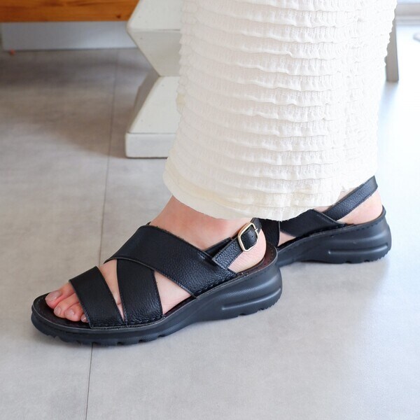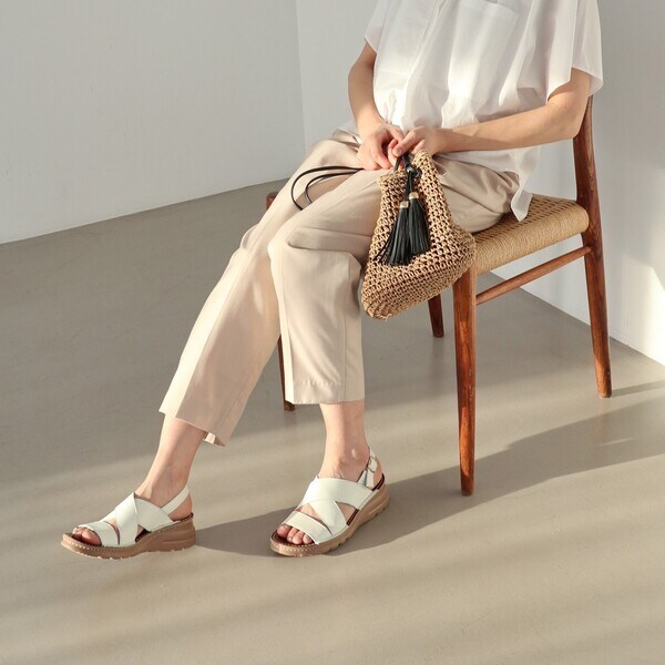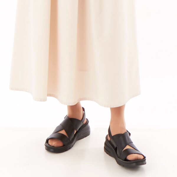 クロスした幅広のレザーストラップが足を優しくホールドしつつ、トレンド感もプラス。