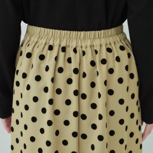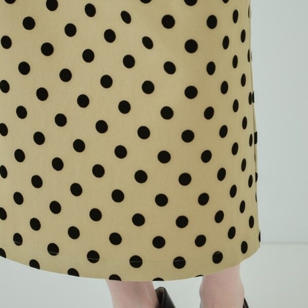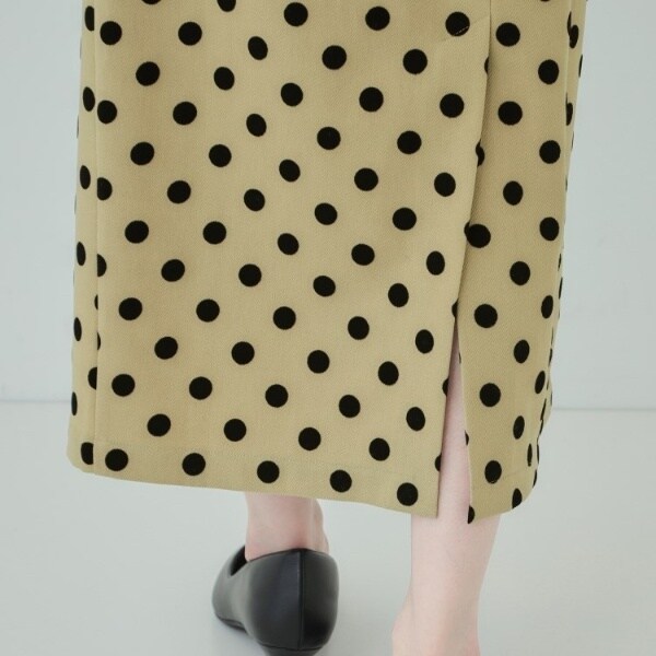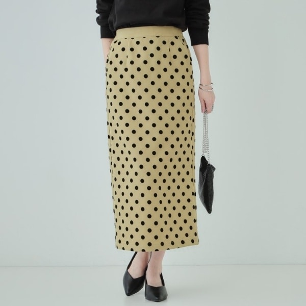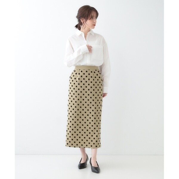 洗練された女性らしさを演出するフロッキードット柄のナロースカート。