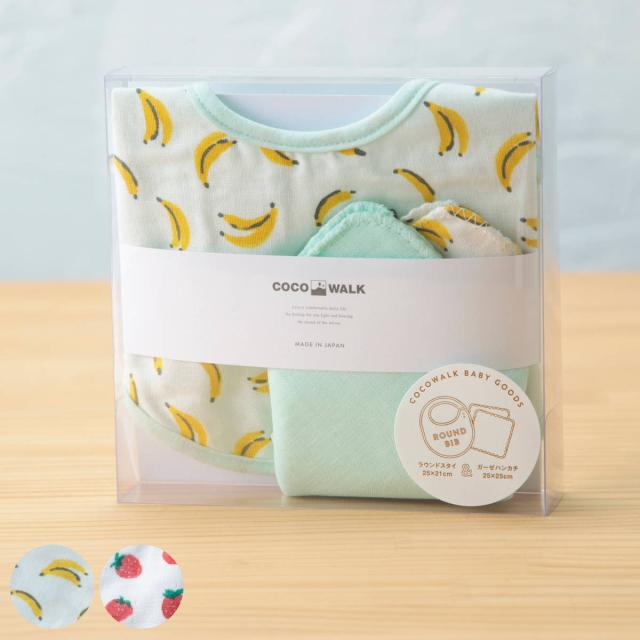フルーツ柄のスタイ1枚とハンカチ2枚が入ったギフトボックスです。使う頻度の高いもののセットなので、お母さん・お父さんにも喜ばれます。イチゴとバナナの2種類があります。
