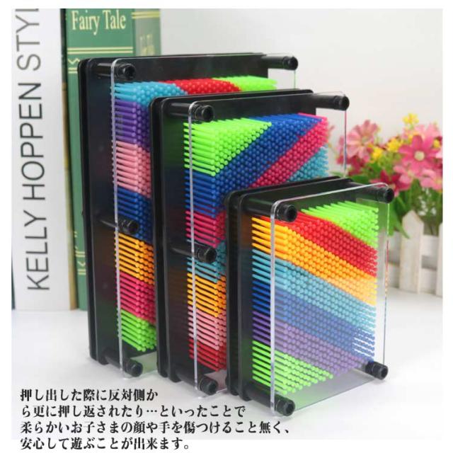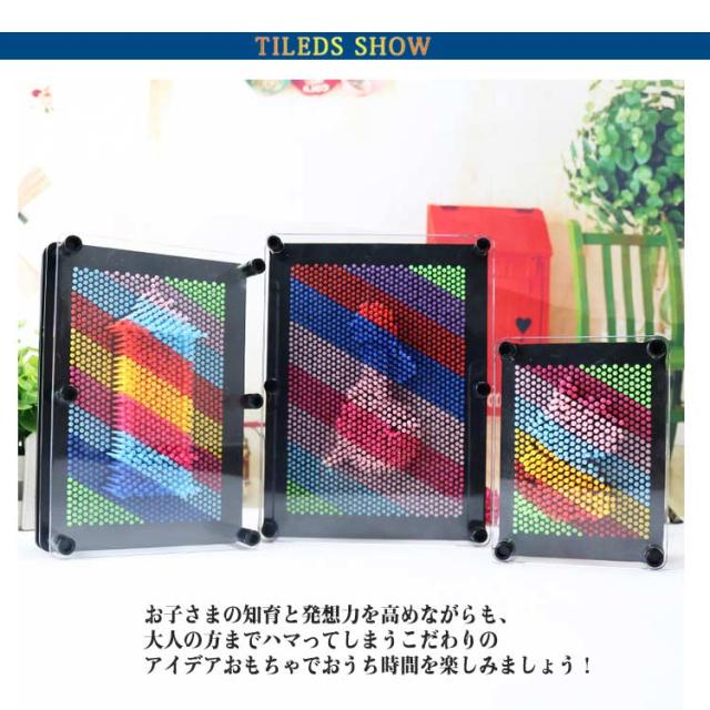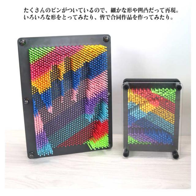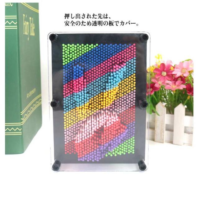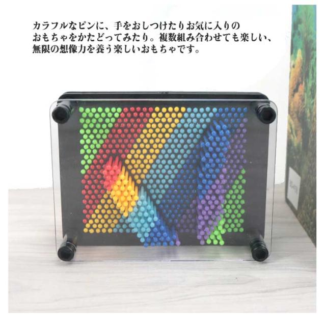 | 押し込むだけの簡単アート♪ 楽しさ無限大のピンアートボード。 カラフルなピンに、手をおしつけたりお気に入りのおもちゃをかたどってみたり。複数組み合わせても楽しい、無限の想像力を養う楽しいおもちゃです。 たくさんのピンがついているので、細かな形や凹凸だって再現。 いろいろな形をとってみたり、皆で合同作品を作ってみたり。 押し出された先は、安全のため透明の板でカバー。 押し出した際に反対側から更に押し返されたり…といったことで柔らかいお子さまの顔や手を傷つけること無く、安心して遊ぶことが出来ます。 お子さまの知育と発想力を高めながらも、大人の方までハマってしまうこだわりのアイデアおもちゃでおうち時間を楽しみましょう! | |