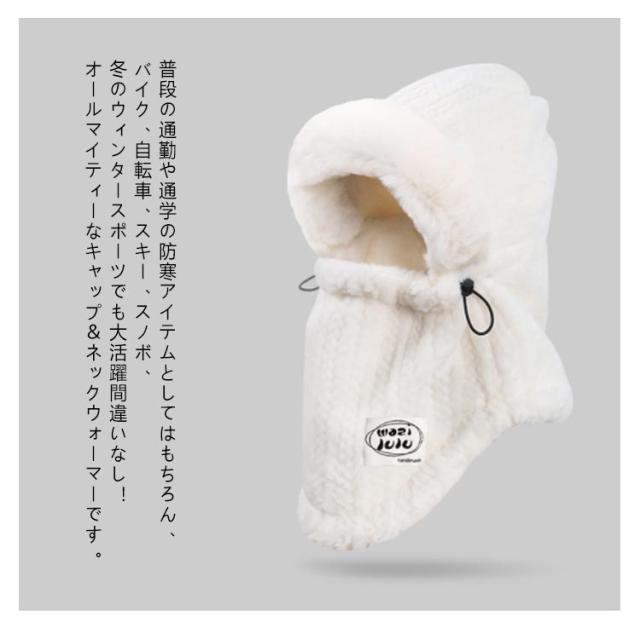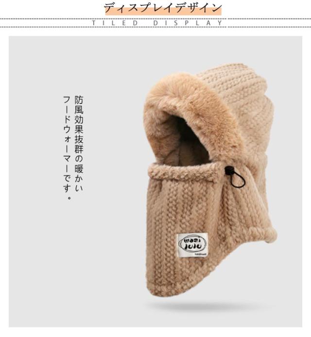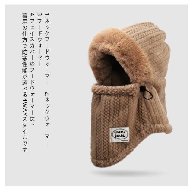 | 完全防備!真冬にも乗り越える! 裏起毛付きで極厚! フードウォーマー 防風効果抜群の暖かいフードウォーマーです。 ・超厚の毛糸編み構造であなたを温かく包み込み、柔らか裏起毛素材の裏地は心地よい気持ちに!型崩れしなく、綺麗なフォルムを実現できます。頭、耳、首元を冷たい風から守ります。 ・1.ネックフードウォーマー 2.ネックウォーマー 3.フードウォーマー 4.フェイスカバーのフードウォーマーは、着用の仕方で防寒性能が選べる4WAYスタイルです ・普段の通勤や通学の防寒アイテムとしてはもちろん、バイク、自転車、スキー、スノボ、冬のウィンタースポーツでも大活躍間違いなし!オールマイティーなキャップ&ネックウォーマーです。 | |