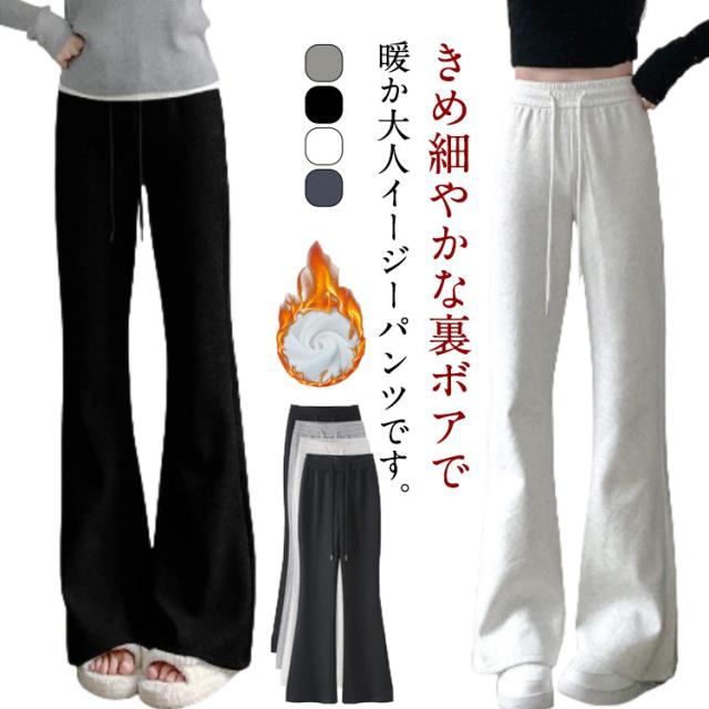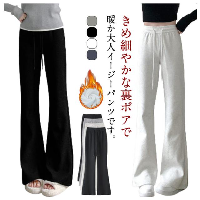 | きめ細やかな裏ボアで暖か大人イージーパンツです。 薄手タイプが新登場!ウエストゴムで楽チンなのに美シルエット! キュッと締まりふんわり広がる計算された美脚フレアラインスタイルアップUP! 細すぎず太過ぎずのシルエットで色々なトップスとも楽ちんに着映えします。 ストレスフリーな穿き心地でおうち時間にもオススメ。寒い日もアクティブにおしゃれを楽しめちゃう。 | |