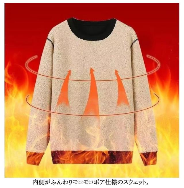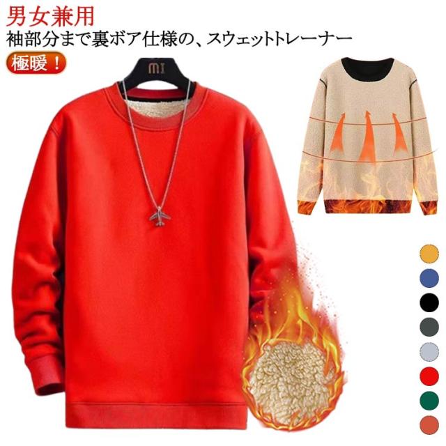 | 男女兼用 極暖!袖部分まで裏ボア仕様の、スウェットトレーナー 超暖かい裏ボア無地トレーナー 内側がふんわりモコモコボア仕様のスウェット 毛布に包まれたような暖かさで、寒い季節の部屋着やパジャマにおすすめ | |