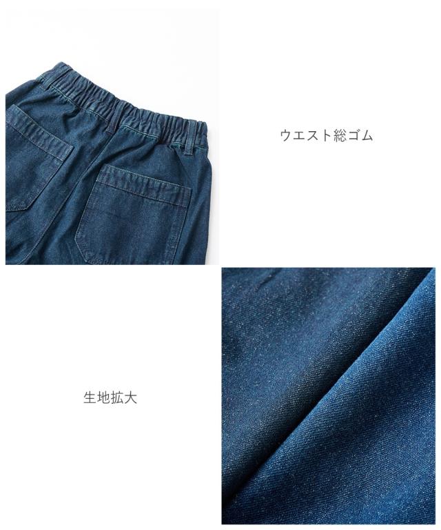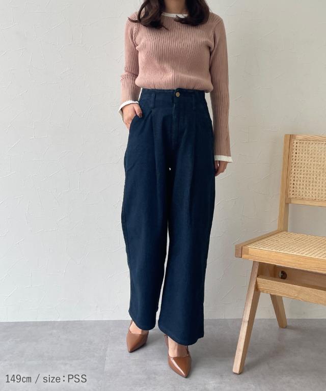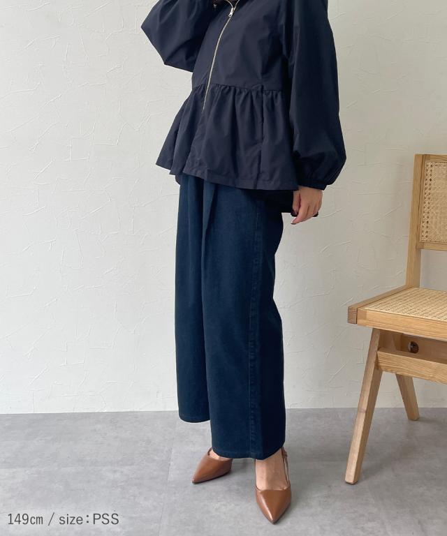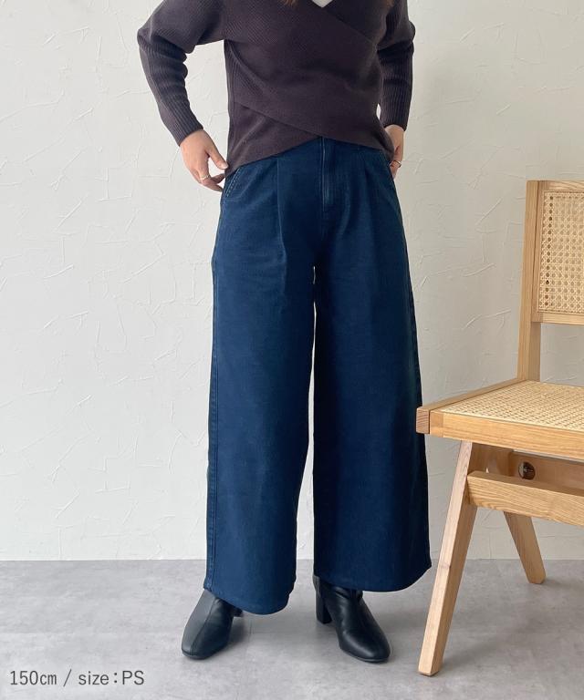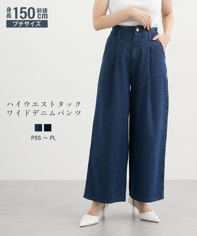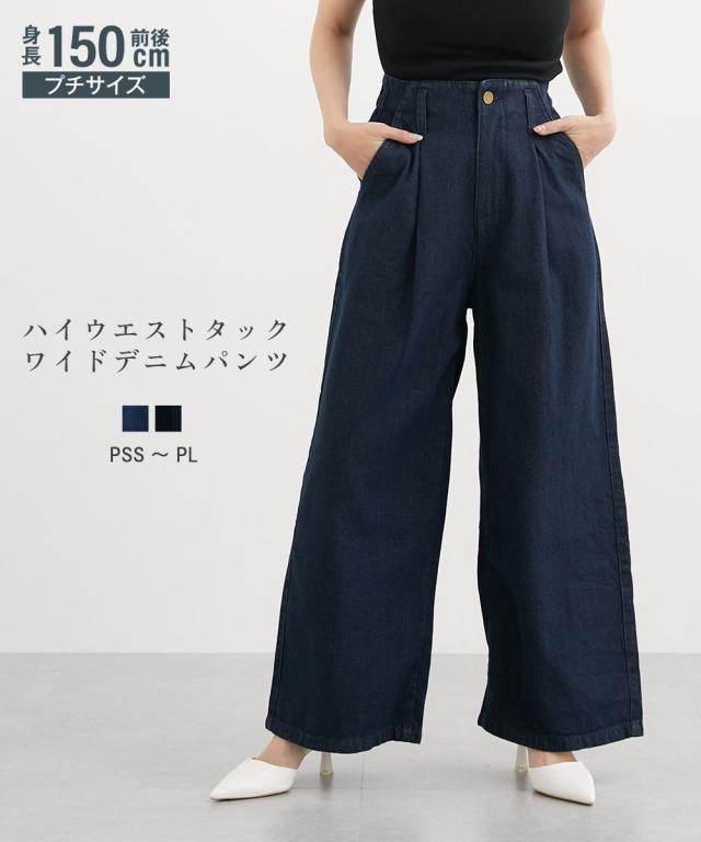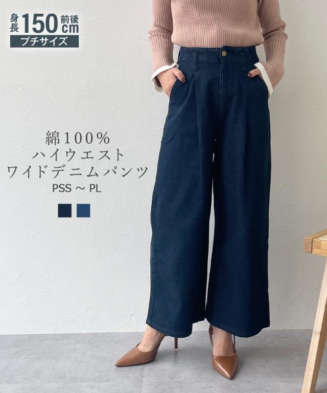 小さいサイズ 綿100%ウエストタックハイウエストワイドデニムパンツ 低身長さん・小柄女性