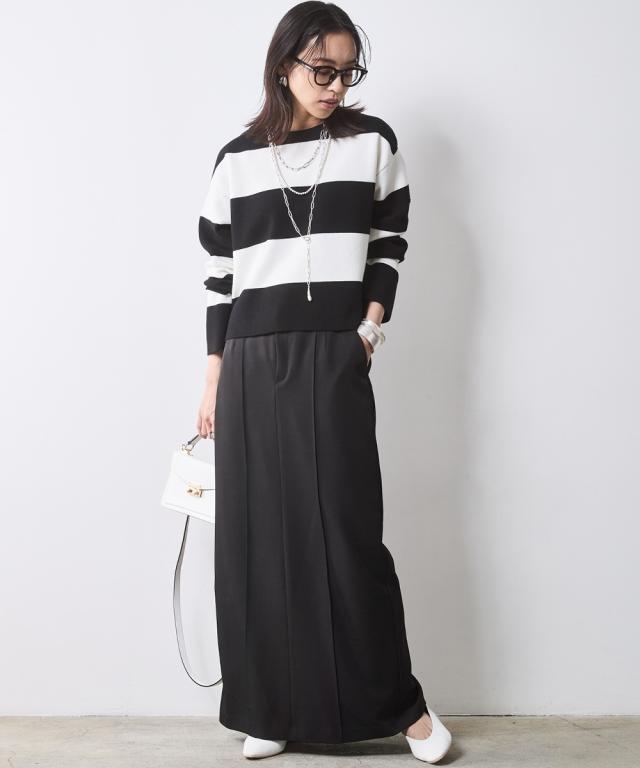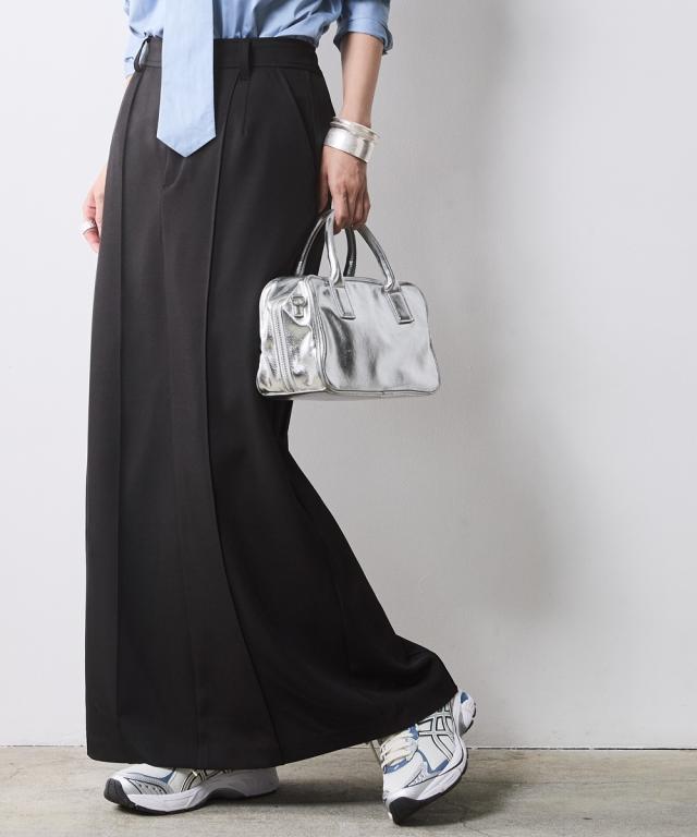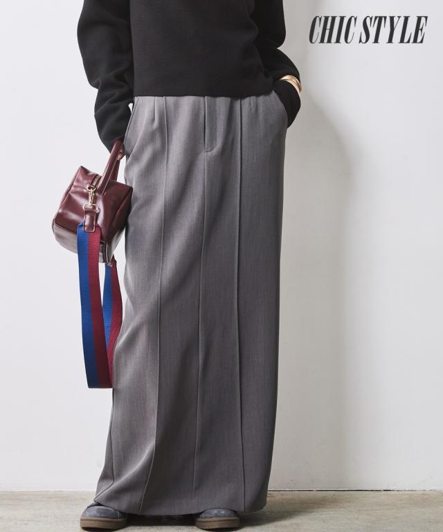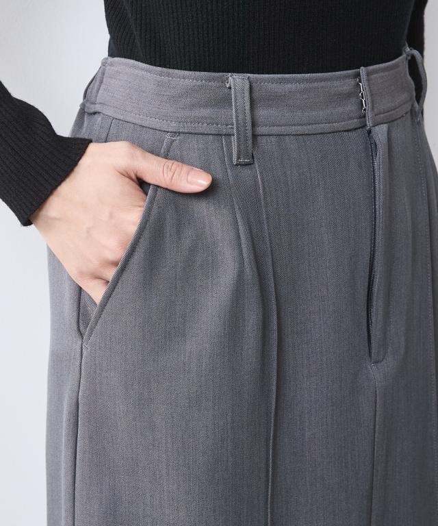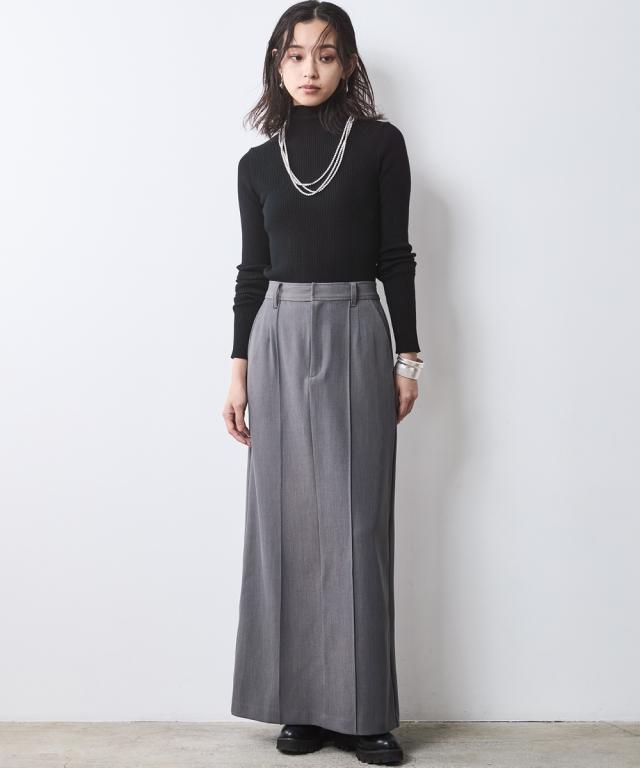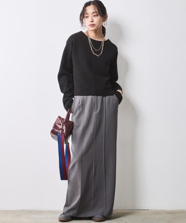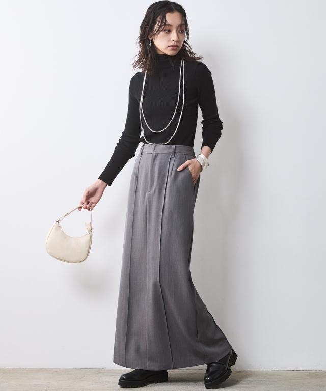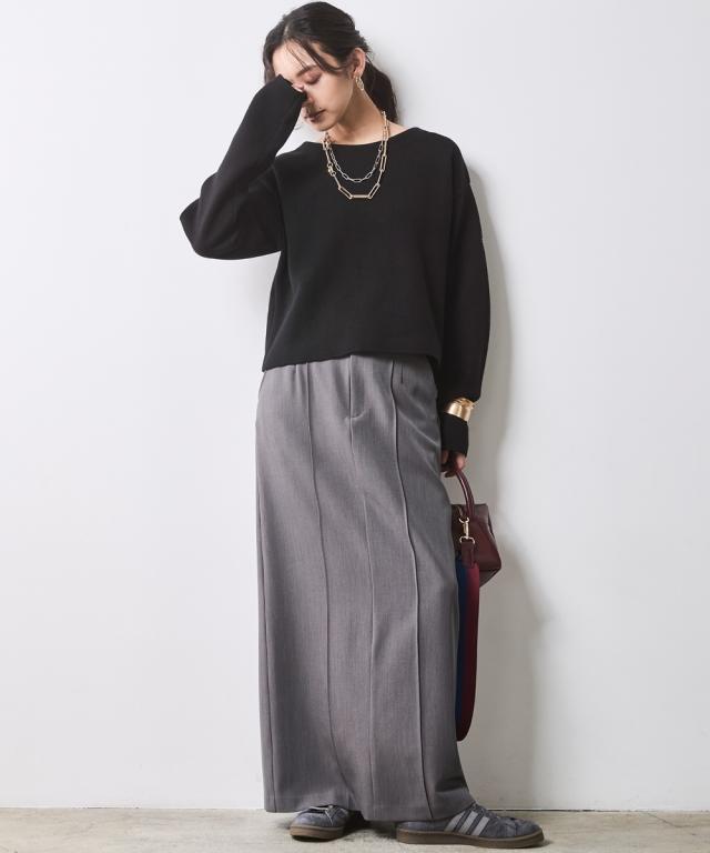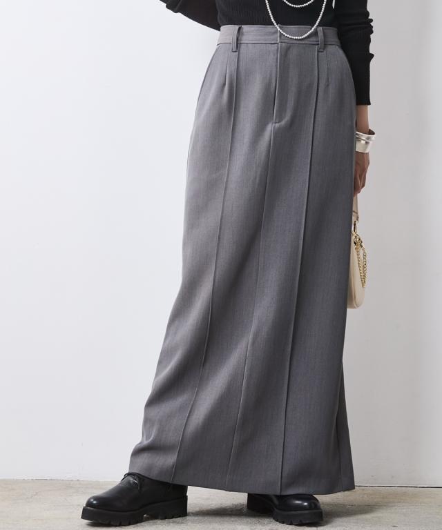 ハンサムなマキシタイトスカート。 ■デザイン パンツのディテールを入れ込んだマキシ丈タイトスカート。 程よいフィット感のあるサイジングで大人っぽく女性らしいシルエットを演出してくれます。 後ウエストはゴム仕様で快適な履き心地。 パンツディテールのつまみが縦に入っていることでタテラインが強調されスタイルアップ効果も。 ■素材 シーズンレスに使えるライトウェイトなスーチング素材。 ポリエステルの丈夫さとレーヨンの持つ落ち感で上品な光沢感と手触りの良さを併せ持つ素材を使用。 ■おすすめのスタイリング 合わせるトップスでオンにもオフにもイメージを変えられる万能スカート。